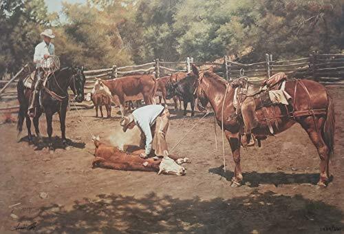 Product description: Branding the Maverick is a signed and numbered limited edition print by Tim Cox. It depicts a couple of cowboys working cows in the pen. They are branding a cow while the other cattle look on. The image size is 13 1/2" x 20". Overall size is 19" x 25". It was published by Texas Art Press in 1979 in a limited edition of 2,250. About the Artist: Endless nights of painting until dawn are finally paying off for Tim Cox. He is one of the best known western artists, having been voted into the U. S. Art Magazines Print Hall of Fame - 2000. Dozens of his Limited Edition Prints have sold out through the years - some as quickly as 3 weeks. Sales of his popular calendar line which started in 1986 have exceeded four million to date. One of the best compliments paid to his calendars is that you often see his tear off style calendars complete, late in the year. People will lift off the pages to find the date rather than tear them off! Tim's paintings have appeared on over 110 magazine covers through the years, and he has been featured in articles in at least 16 different publications, including Southwest Art, Western Horseman, Art of the West, American Cowboy and Beef.