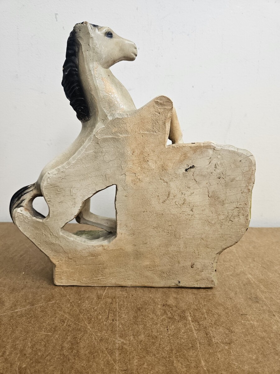 This is a cool piece but it does have some issues. There are several pieces of the chalkware that has broken off. There is also some paint loss. I still think it displays pretty well. It measures 11" tall x 10.25" wide. Be sure to check out my pictures for complete description. Please contact me with questions, and be sure to check out my other items as I will combine shipments to save you money on shipping. Thank you for looking.