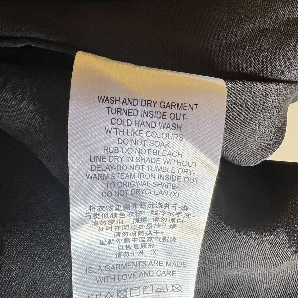 Cold hand wash, line dry in shade, warm steam iron inside out. Do not bleach, soak, tumble dry, or dry clean.