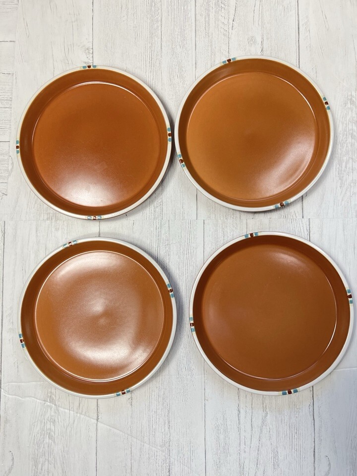 Beautiful Dansk Mesa Rust stoneware plate set from Dansk International Designs Ltd., KW/Japan. This mid-century modern dinnerware features a warm terracotta-brown glaze accented by teal and burgundy rim stripes, combining rustic charm with timeless modern simplicity.