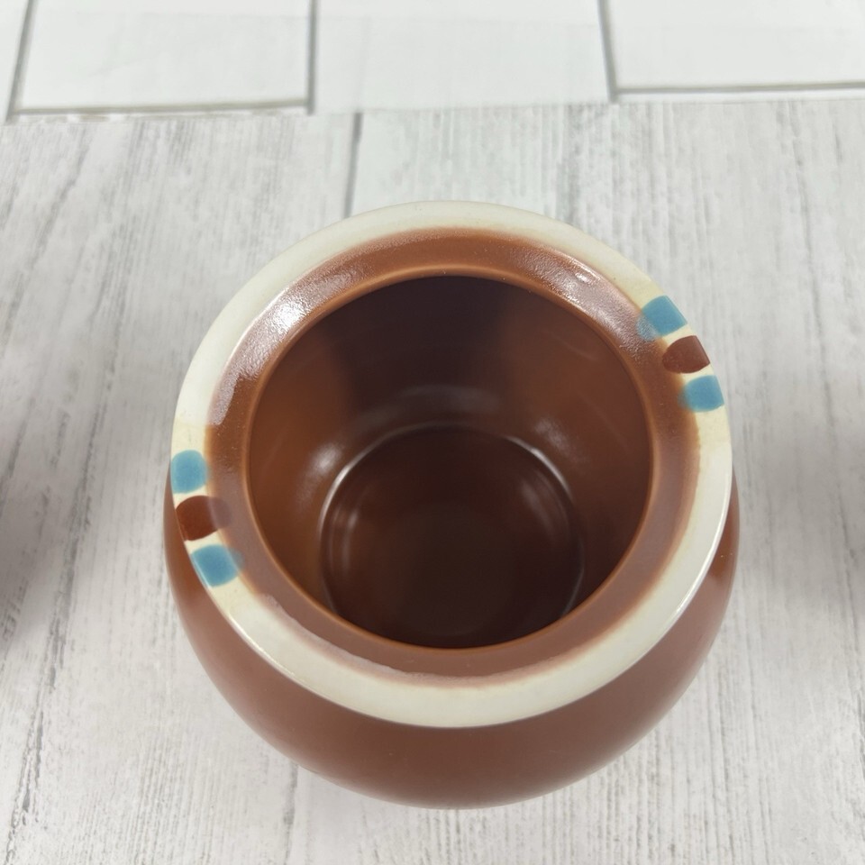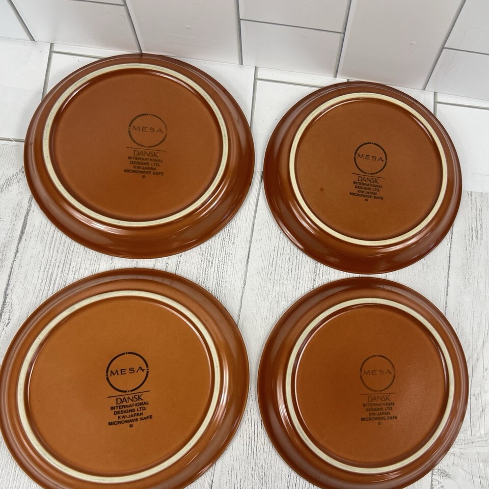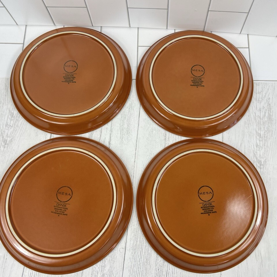 This beautiful Dansk Mesa dinnerware set by Dansk International Designs Ltd. KW/Japan showcases the iconic warm rust brown glaze with hand-painted turquoise and burgundy accent stripes around the rim. Crafted in Japan, this line is highly collectible for its earthy, modernist aesthetic and durable stoneware construction.