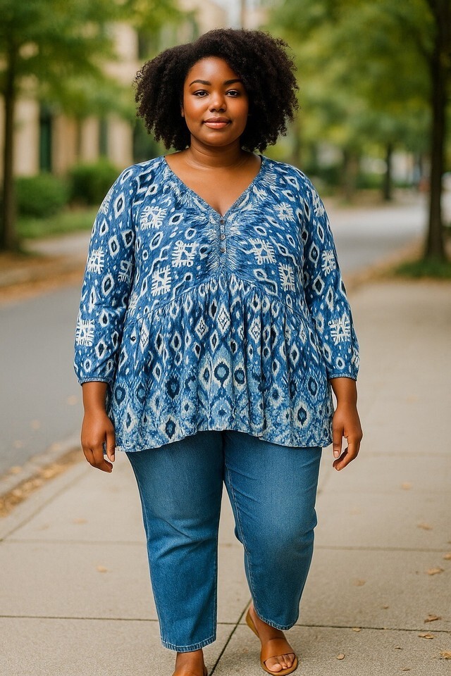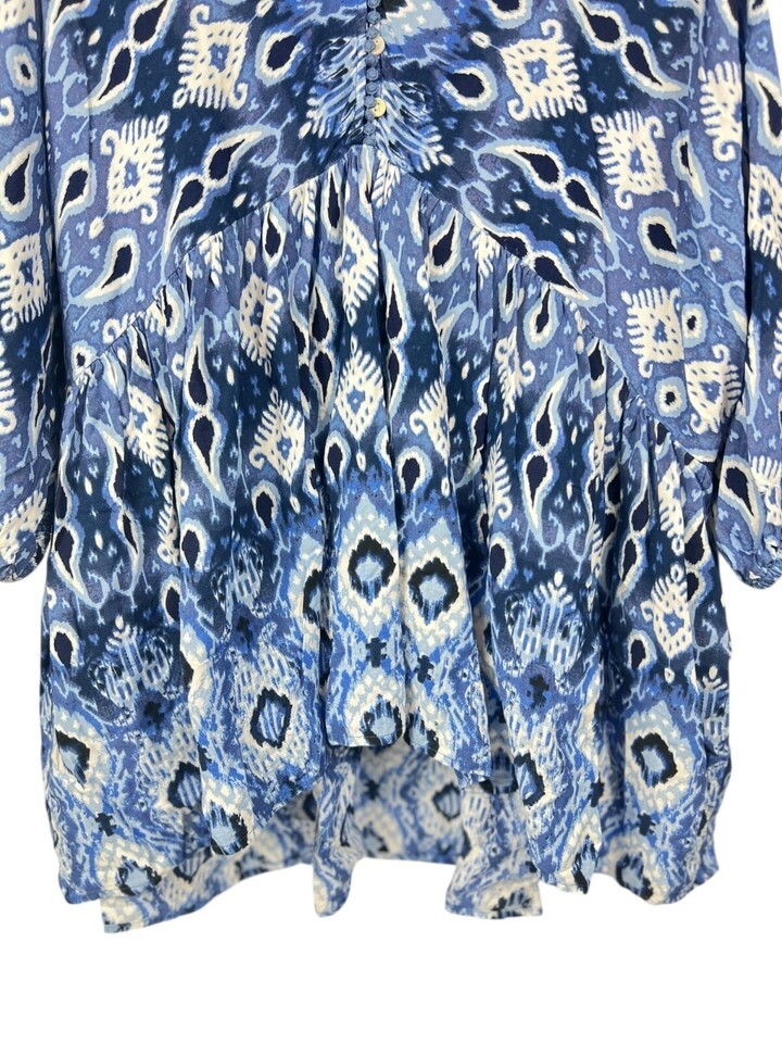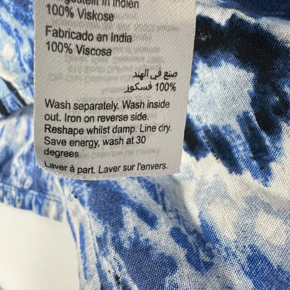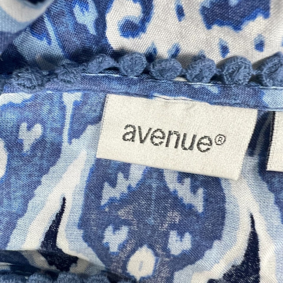 This Avenue tunic features a vibrant blue and white boho pattern, lightweight viscose material, and button details. Designed for comfortable wear in size 22/24.