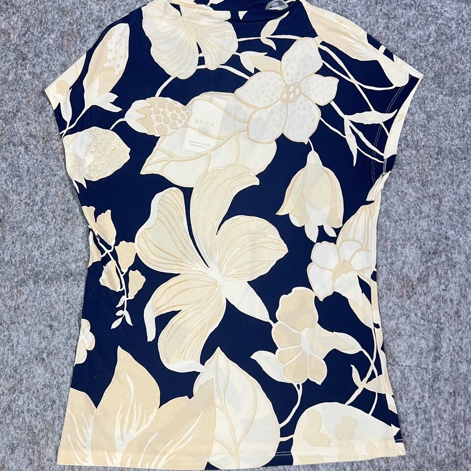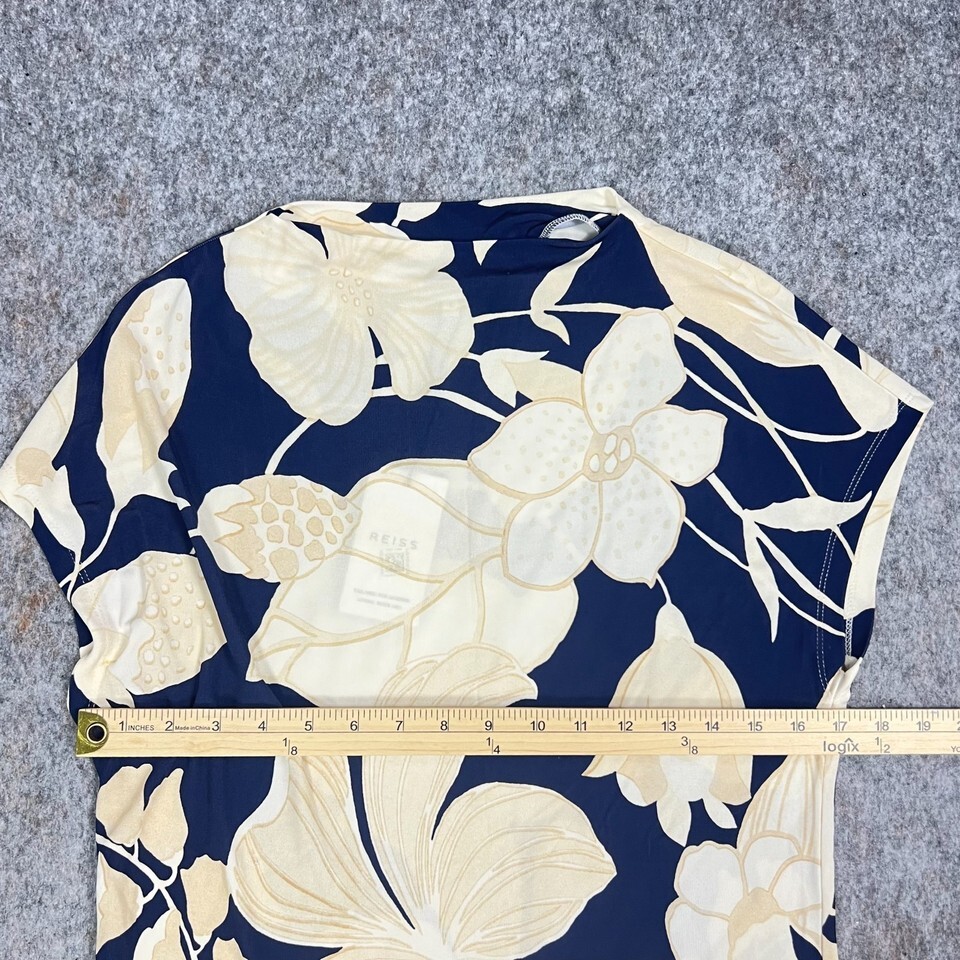 Reiss Poppy Print Floral Top Size Small Navy Cream Short Sleeve Stretch Viscose Blouse