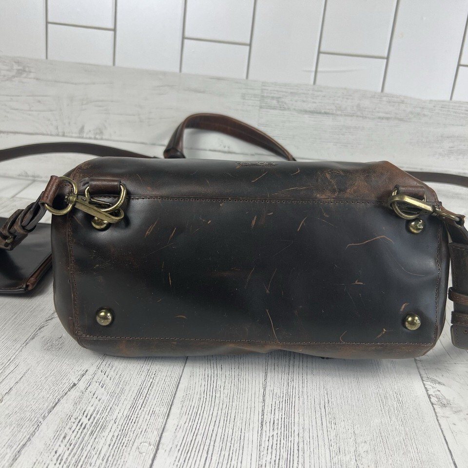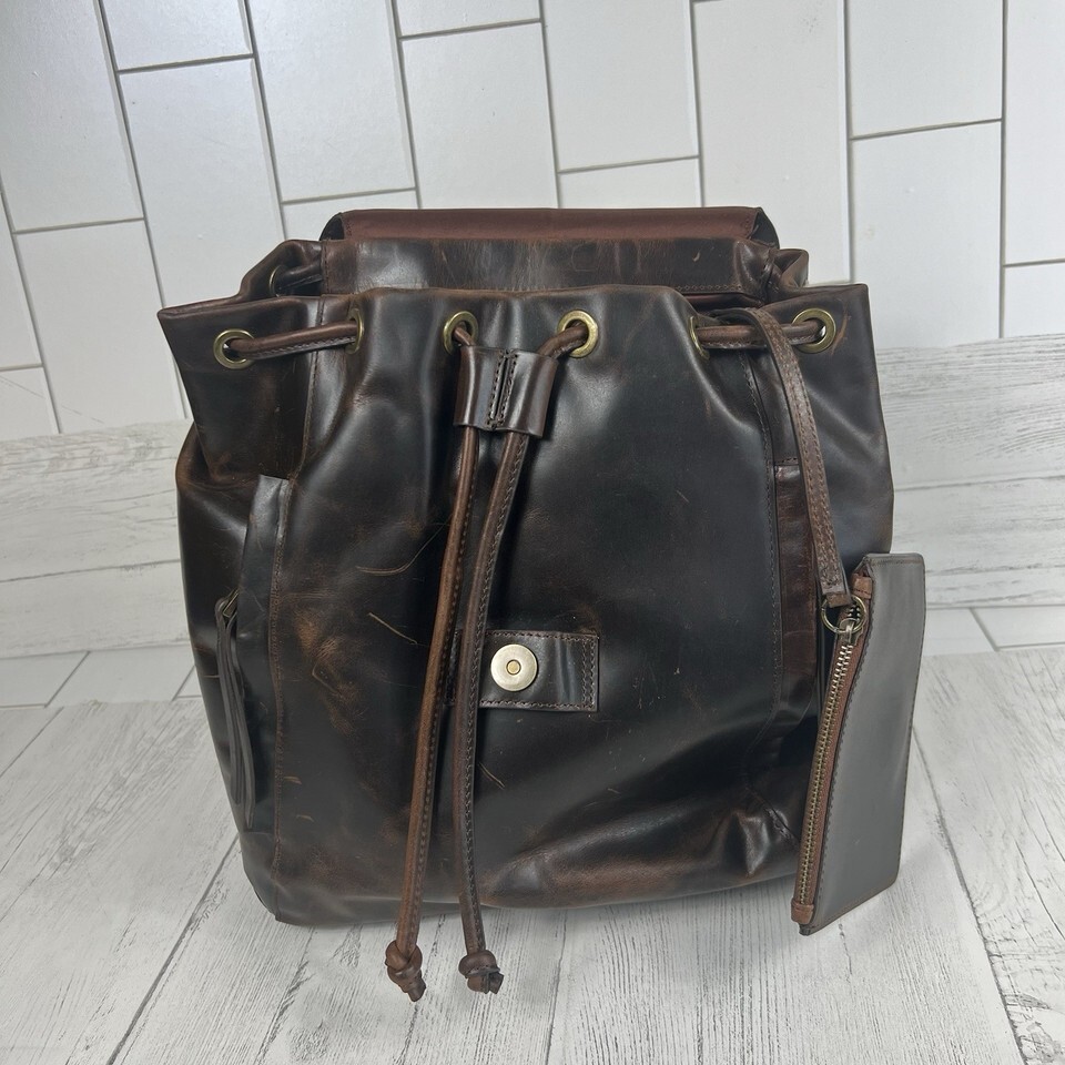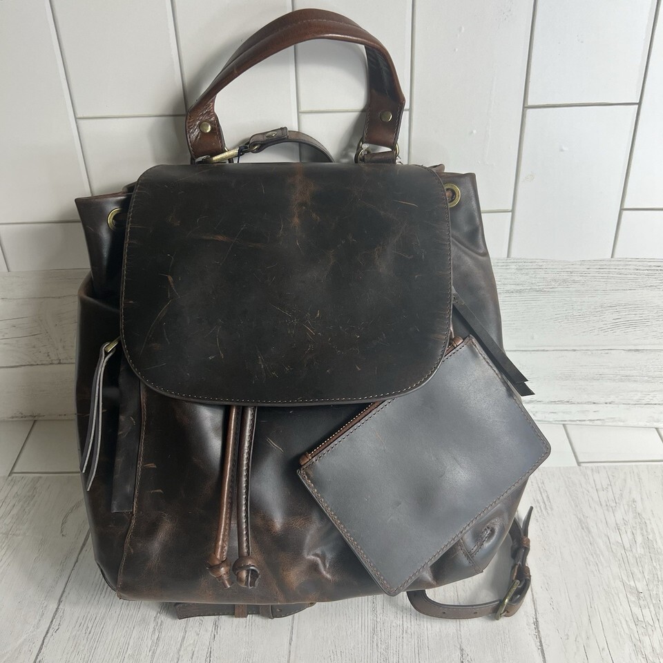 The rich dark brown leather features natural distressing, giving each bag a unique character. The interior offers a roomy compartment with multiple organizational pockets, making it perfect for work, school, or travel. Comes with a detachable zip pouch for added storage.