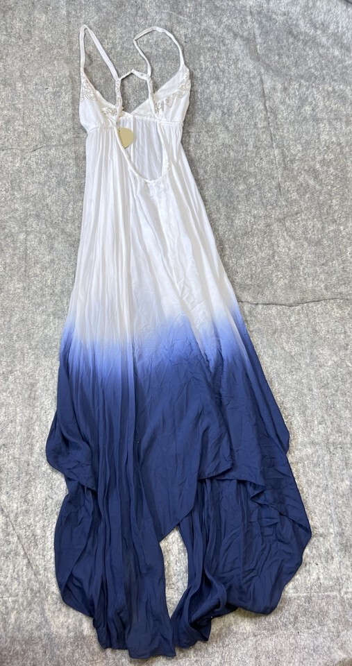 Artelier Nicole Miller Blue White Ombre Maxi Dress M Beaded Halter Tassel Boho Resort Beach Viscose Dip Dye Sleeveless Summer Open Back Flowy Festival Chic Lightweight Vacay Party Pool Coverup