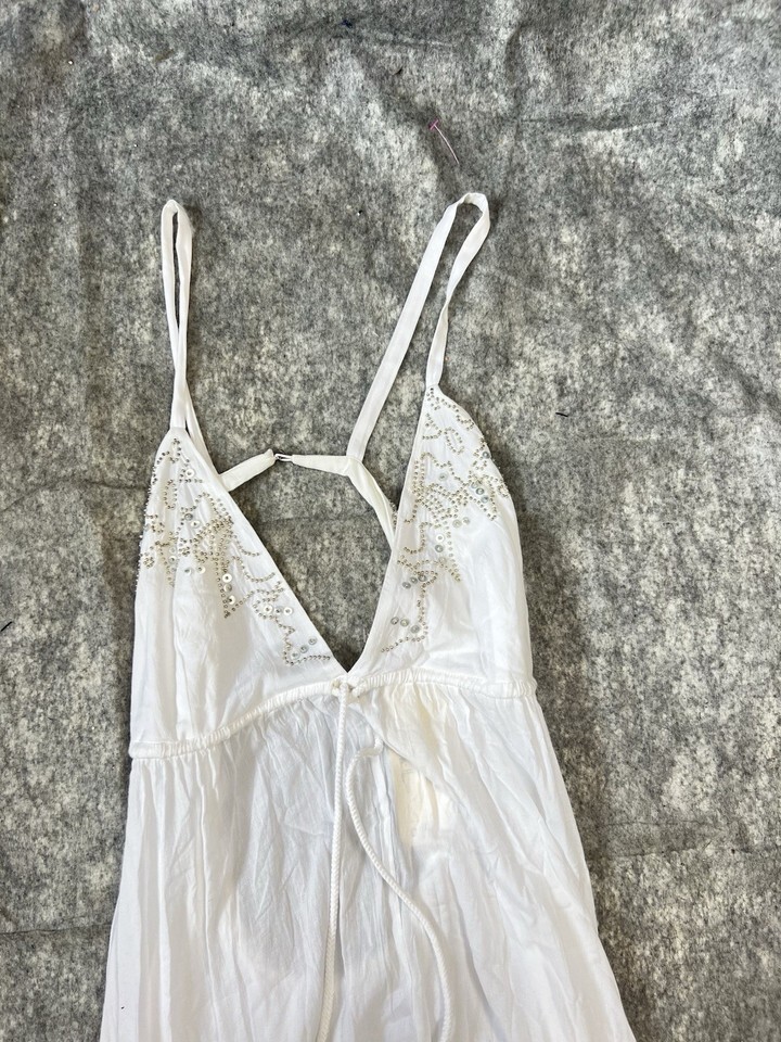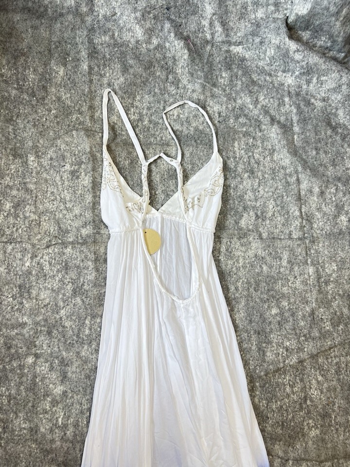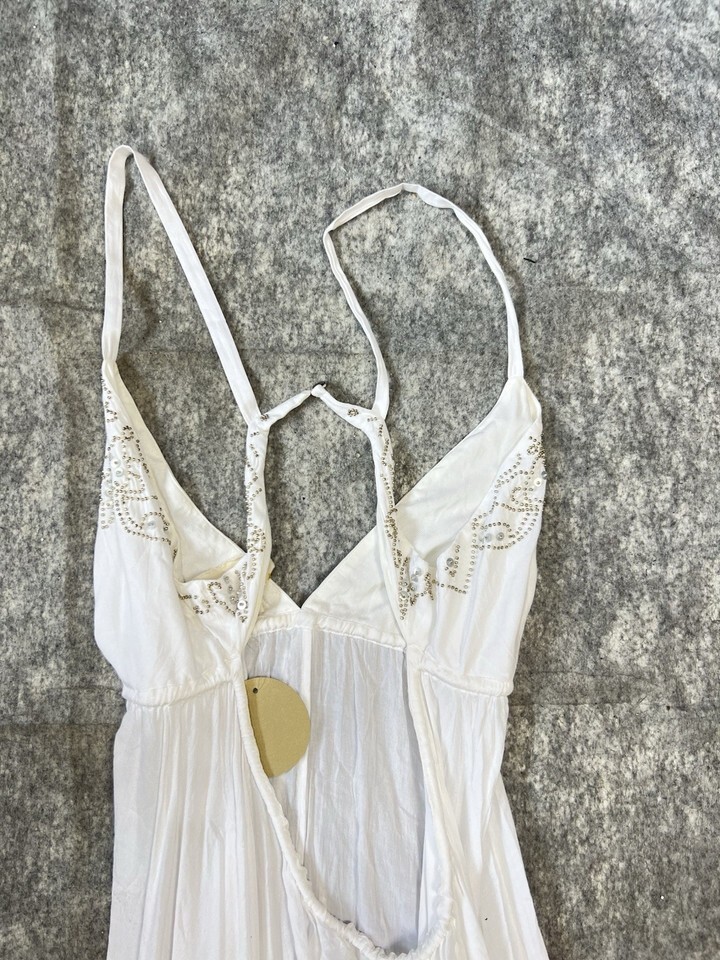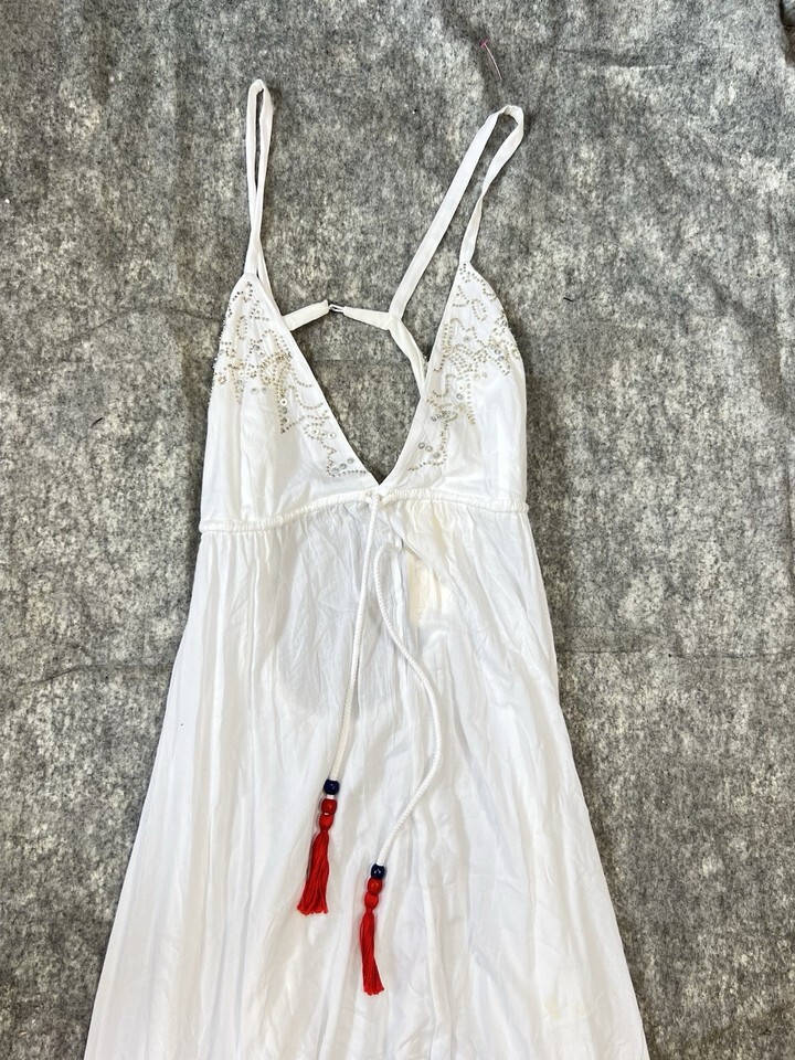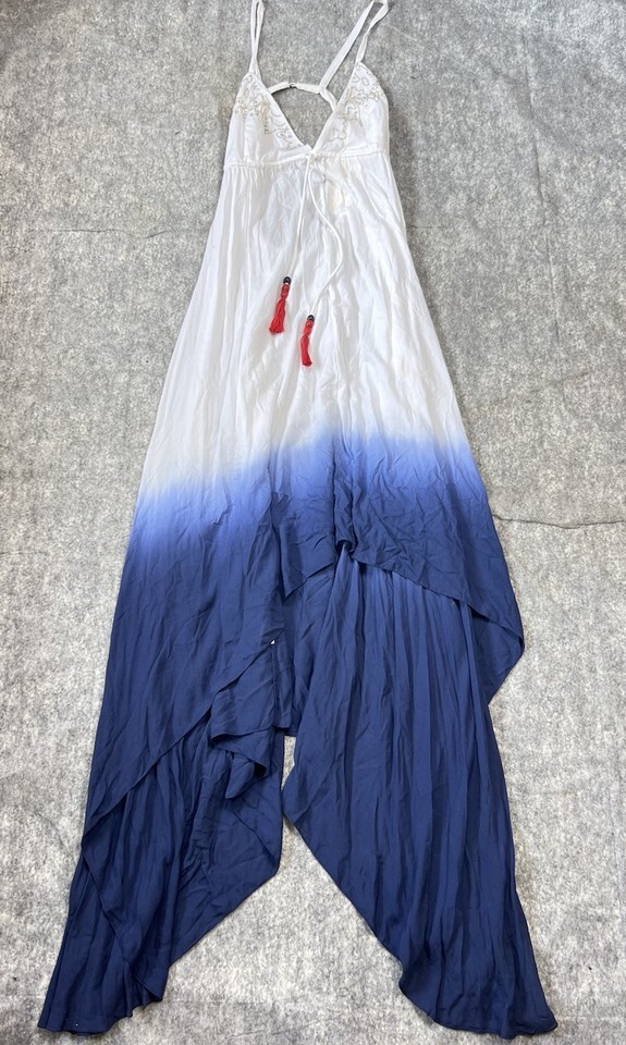 Step into effortless boho glam with this stunning Artelier Nicole Miller maxi dress in size M. Crafted from 100% viscose, this dip-dye ombre dress transitions from crisp white to deep navy blue. The sleeveless halter design features elegant beaded detailing along the bust and a flattering open back with tassel tie accents in vibrant red and navy. Lightweight and flowy, it's perfect for summer getaways, beach days, music festivals, or poolside lounging. A true statement piece with resort-chic vibes!