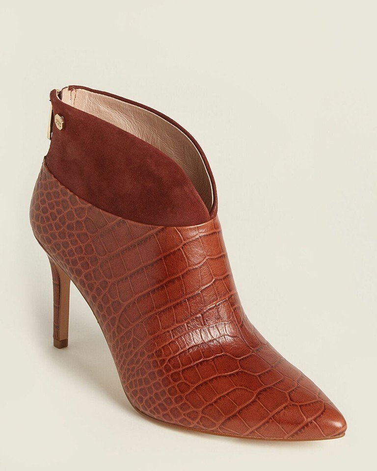 Leather upper, pointed toe, embossed croc detailing, suede opening with front V-shaped cutout, counter zip closure