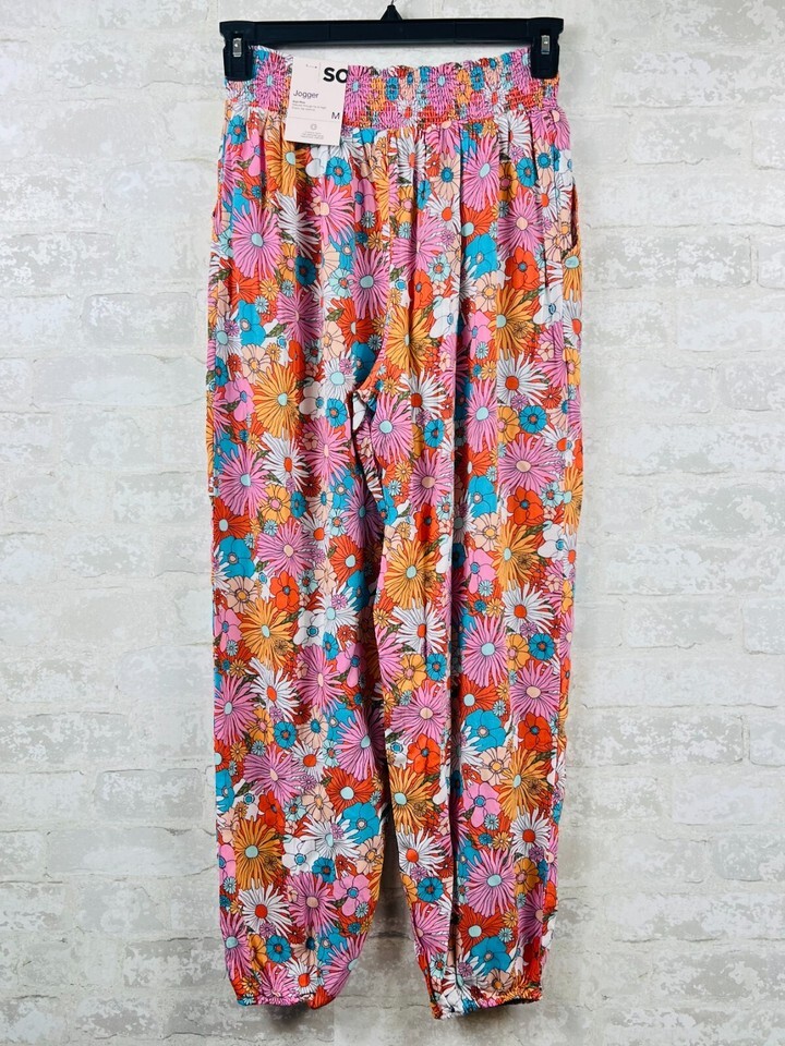 Keywords: SO, joggers, pants, floral print, high rise, elastic waist, relaxed fit, boho, bohemian, casual, loungewear, medium, rayon, smocked waist