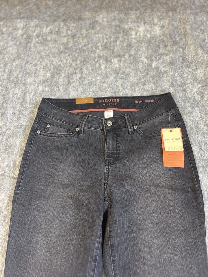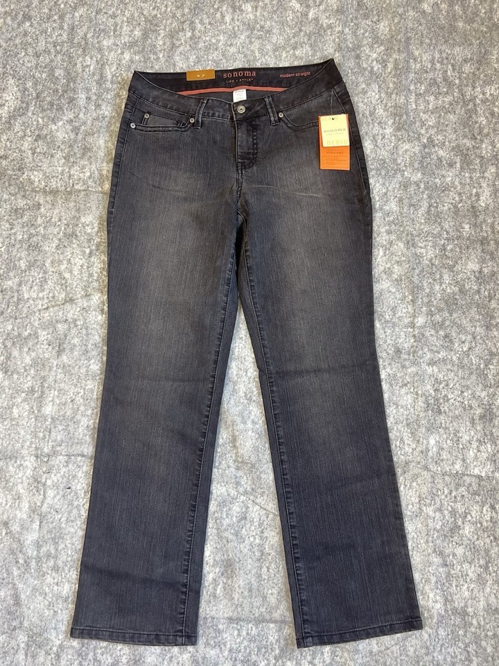 New with tags Sonoma Life + Style modern fit straight jeans in size 10 Short. These jeans offer a flattering mid-rise fit, straight leg, and comfortable stretch fabric. Designed to sit slightly below the waist with a straight cut through the hip and thigh. Classic black-gray wash for a sleek look. Ideal for casual or business casual wear. Made with a cotton-polyester-spandex blend for comfort and durability.