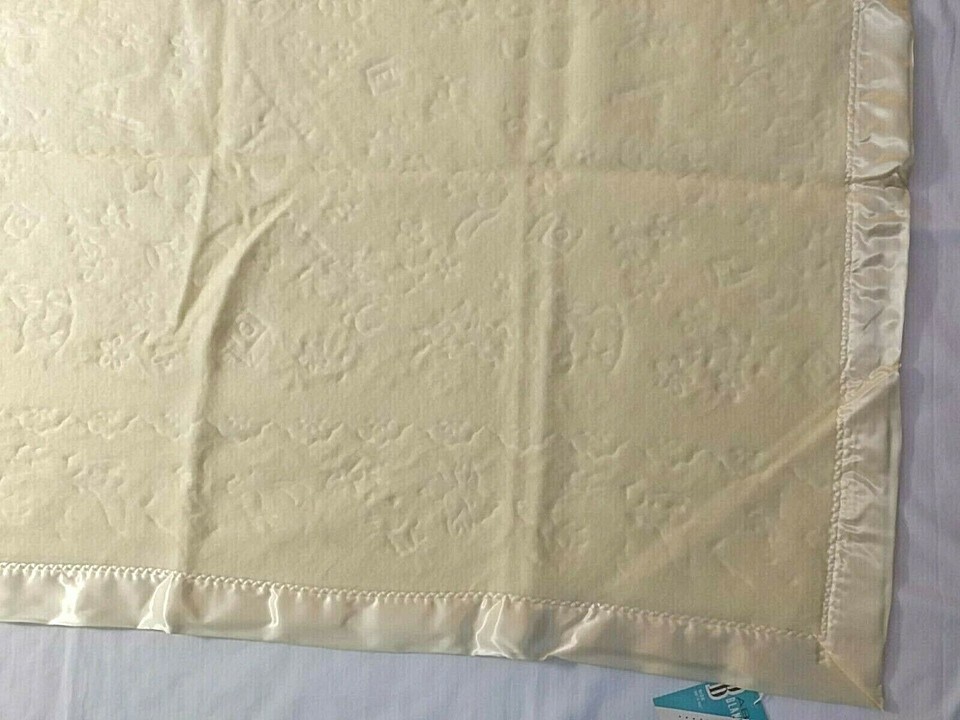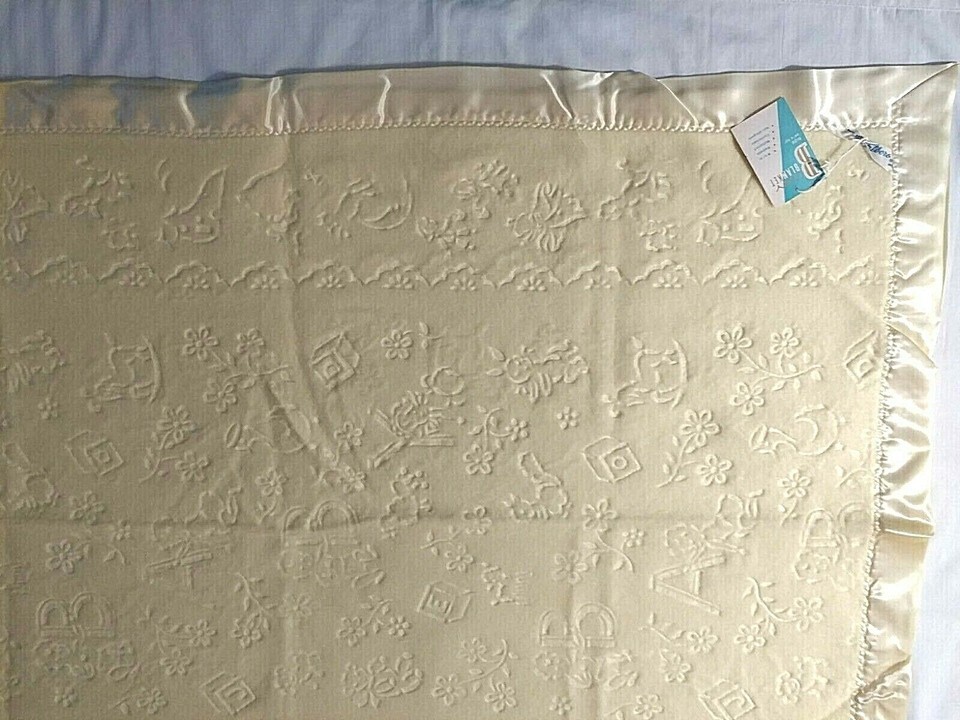 Vtg Yellow Baby Crib Blanket Satin Edge NEW Triboro ORIG TAGS Embossed 36"x50"