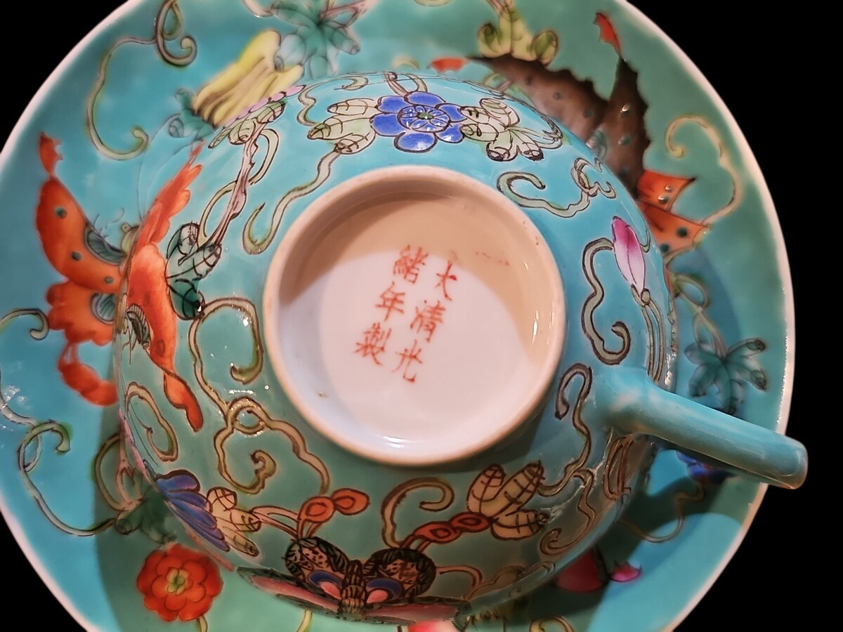 Vintage Chinese Famille Rose Turquoise Butterfly Tea Cup and Saucer Hand Painted