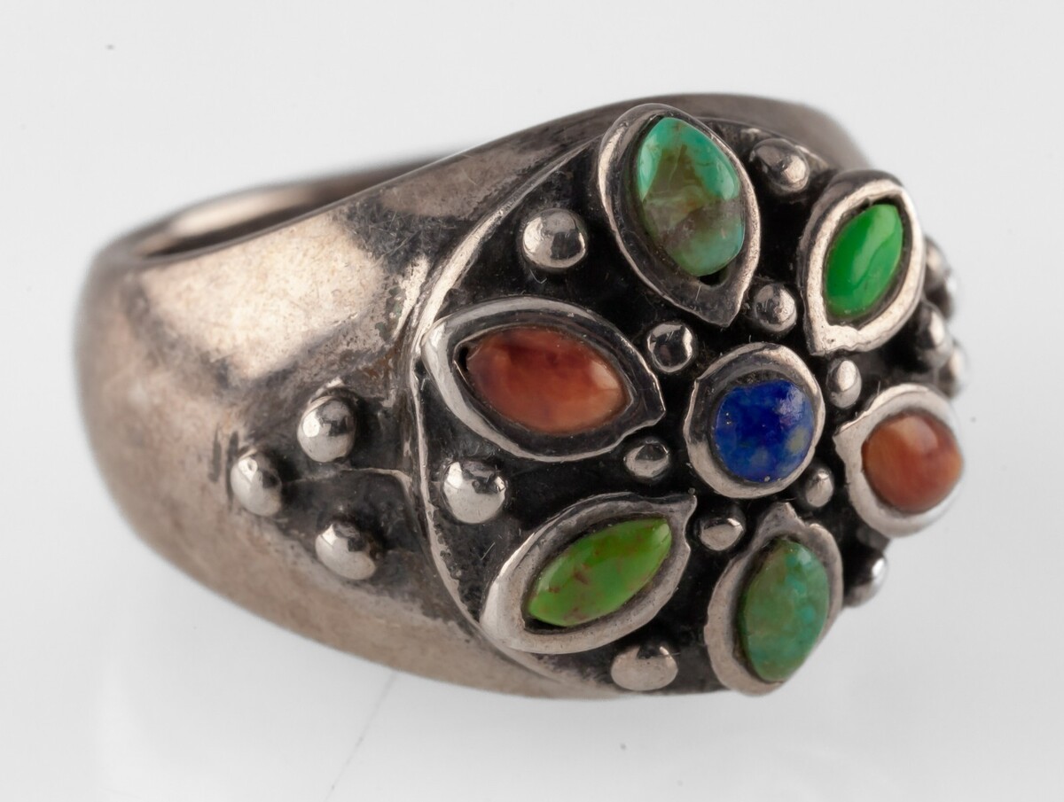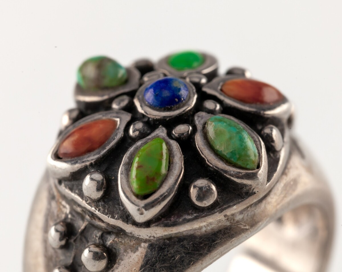 Vintage Sterling Silver Multi-Stone Barse Ring with Turquoise, Lapis, Gaspeite, and Spiny Oyster
