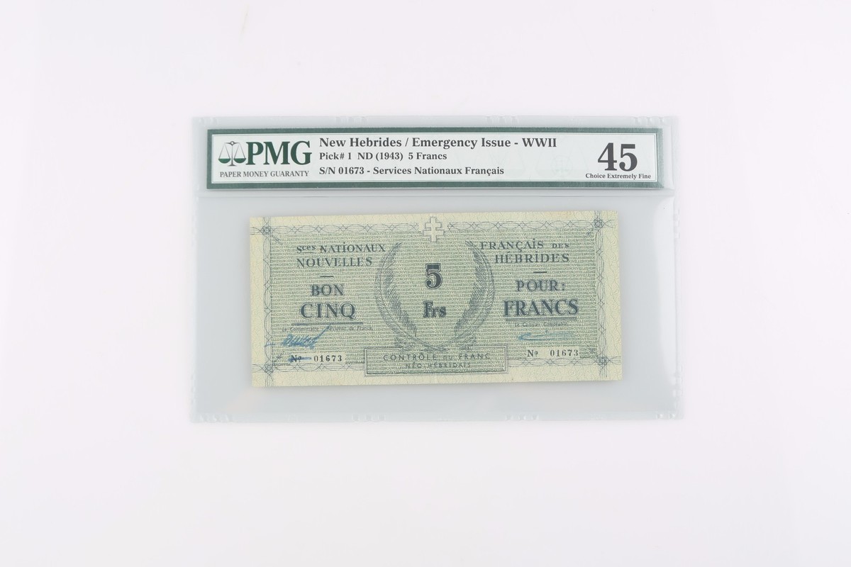 1943 New Hebrides 5 Francs CXF-45 Emergency Issue WWII Choice Extremely Fine P#1 1943 New Hebrides five franc note (5F) Emergency issue by the Free French forces during World War II (1939-1945) No date (ND) printed on note Extremely scare and rare note! Condition: Graded as Choice Extremely Fine 45 by PMG PMG certification number: 2502421-018 Serial number: 01673 Catalog number: Pick#1 All items are professionally packaged and shipped. All shipments include insurance and delivery confirmation or signature confirmation. Local Pick-up is available in our showroom. (Contact us for payment methods to pay on pickup.) California Buyers: 9% sales tax will be added. Returns Policy: About us: Continental Coin and Jewelry Company Web Department: Monday ? Friday, from 10:30am ? 6:00pm PST Visit Our