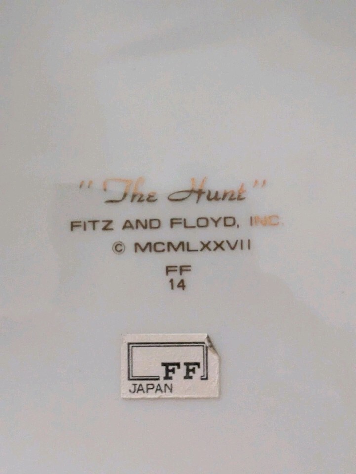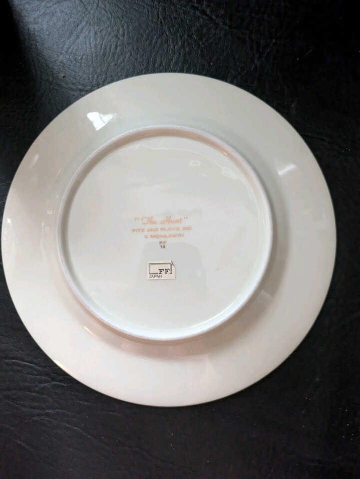 The product is a 1978 Fitz Floyd "The Hunt" salad plate featuring a charming fox hunting theme. Made of porcelain with a glossy finish, the plate showcases a cream, brown, and gold color scheme. With a diameter of 7 1/2 inches, this decorative piece was manufactured in Japan, adding a touch of sophistication to any dining table or collection of pottery and glass. Perfect for serving salads or desserts with a touch of vintage elegance. I have more salad plates, if you need a specific design.
