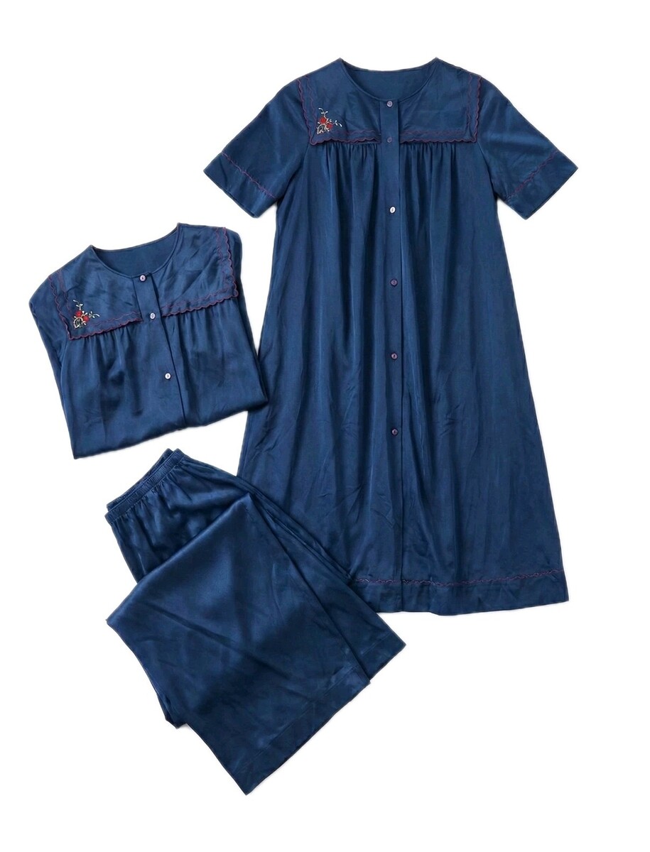 Vintage Shadowline Blue 3 Piece Set Robe Top Bottoms Size 34 Small Embroidery