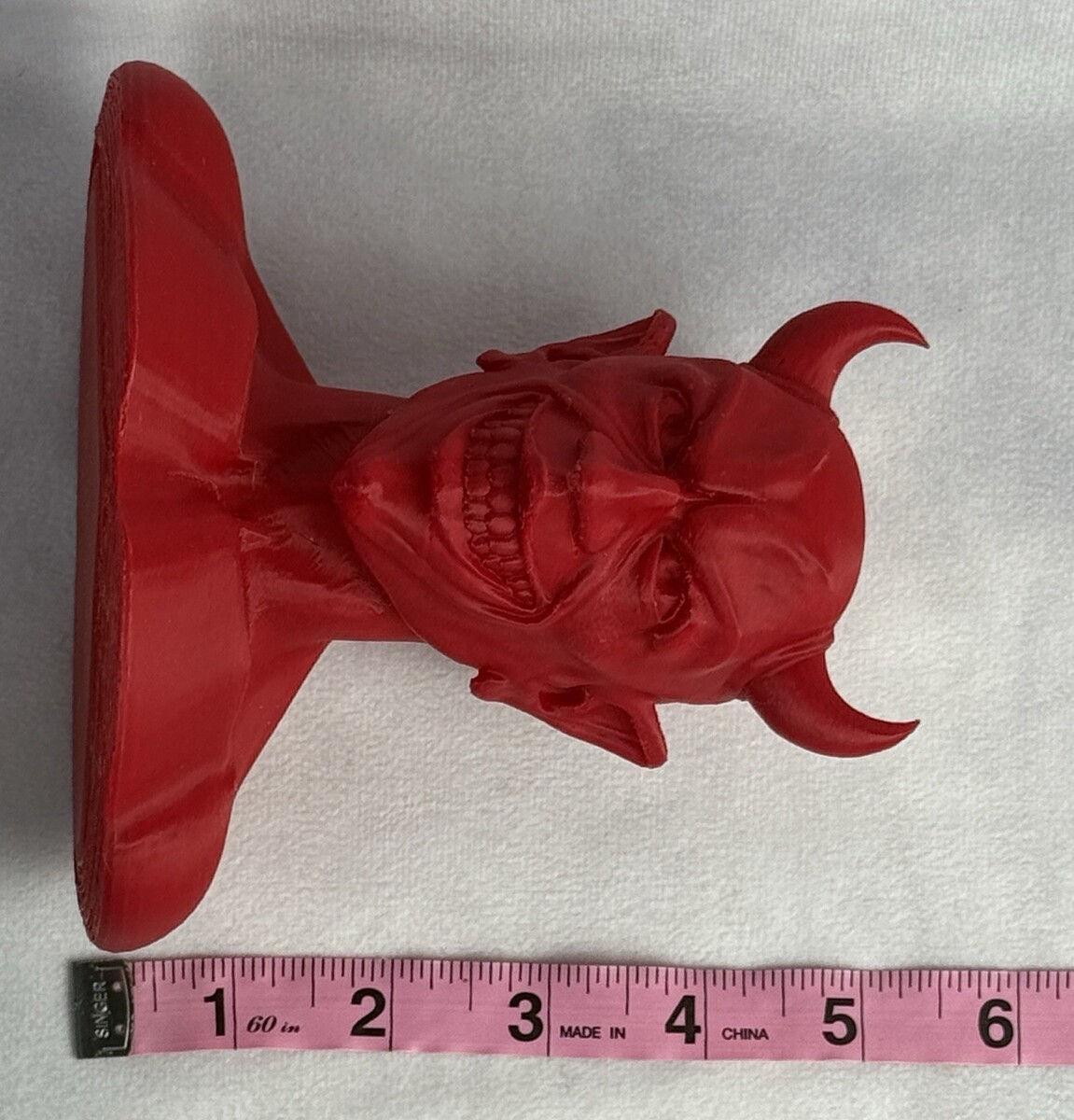 Devil statue, heavy red solid plastic, probably 3D printed, high-quality all the way, large, perfect for desk or bookshelf, measurements can be found in the photos, as pictured, condition as pictured, very very minor lines marks or rough spots, ships within three business days, satisfaction guaranteed.