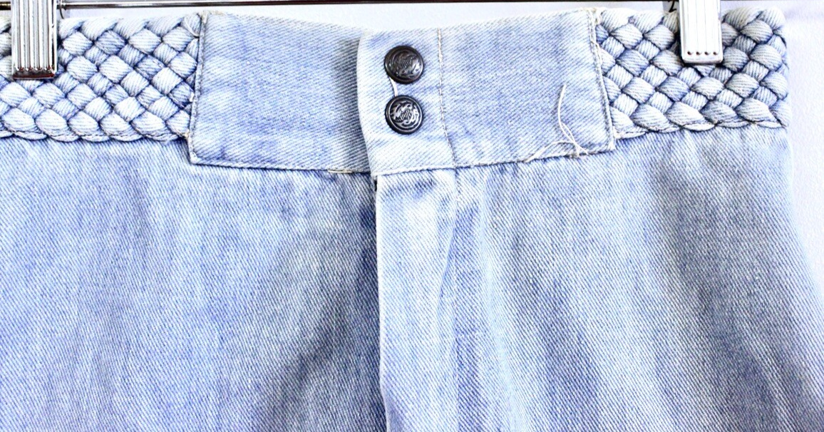 Denim shorts from 1980s?90s Hong Kong production reflect the era when U.S. and European labels outsourced to Asia, resulting in durable, collectible garments with distinctive hardware and washes. The braided waistband is a unique design detail not often seen today.