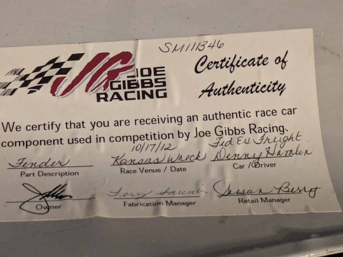 2012 Denny Hamlin Fed Ex Freight 10/17 Kansas Épave Choc FENDER Homme Cave COA