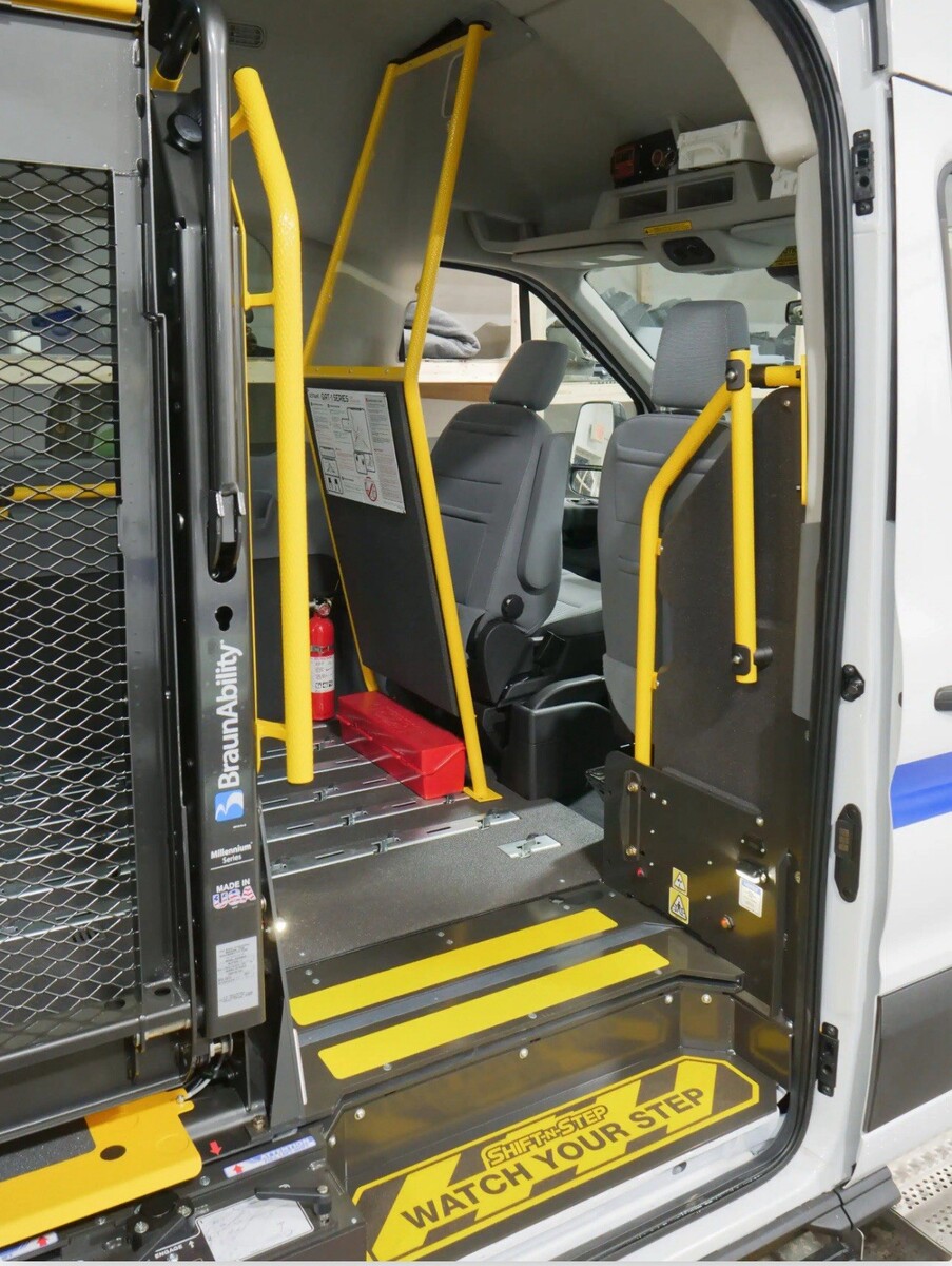 Shift-N-Step Braun transit lift attached grab bar, Ford OEM B-Pillar grab