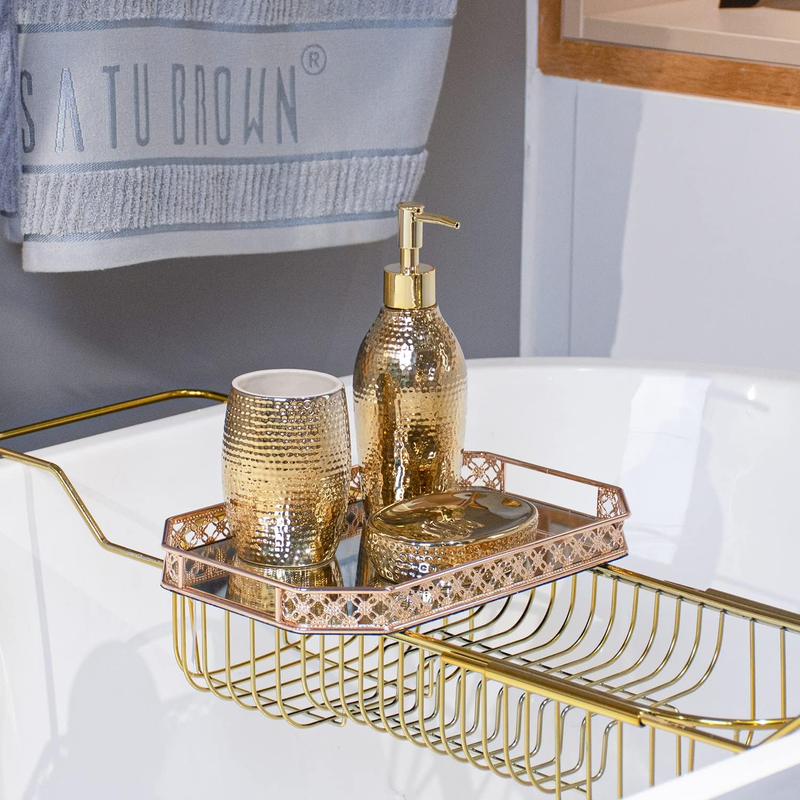 Outfit a new bathroom or upgrade your current set of accessories with Satu Brown gold hammered bathroom accessories set.