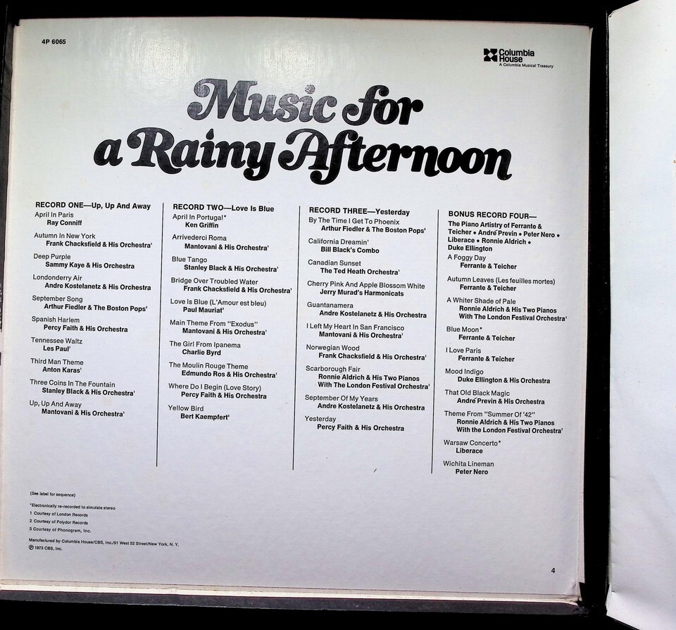This is a 1973 compilation box set titled 'Music for a Rainy Afternoon' by Various artists, released through Columbia House as a club edition. The box set catalog number is 4P 6065, with individual record catalog numbers beginning with 'P'. The tracks are organized alphabetically by record on the cover, with the playback sequence found on the label. Some tracks are electronically re-recorded to simulate stereo. Notable tracks include 'April In Paris' by Ray Conniff, 'Autumn In New York' by Frank Chacksfield His Orchestra, and 'Bridge Over Troubled Water' by Frank Chacksfield His Orchestra.