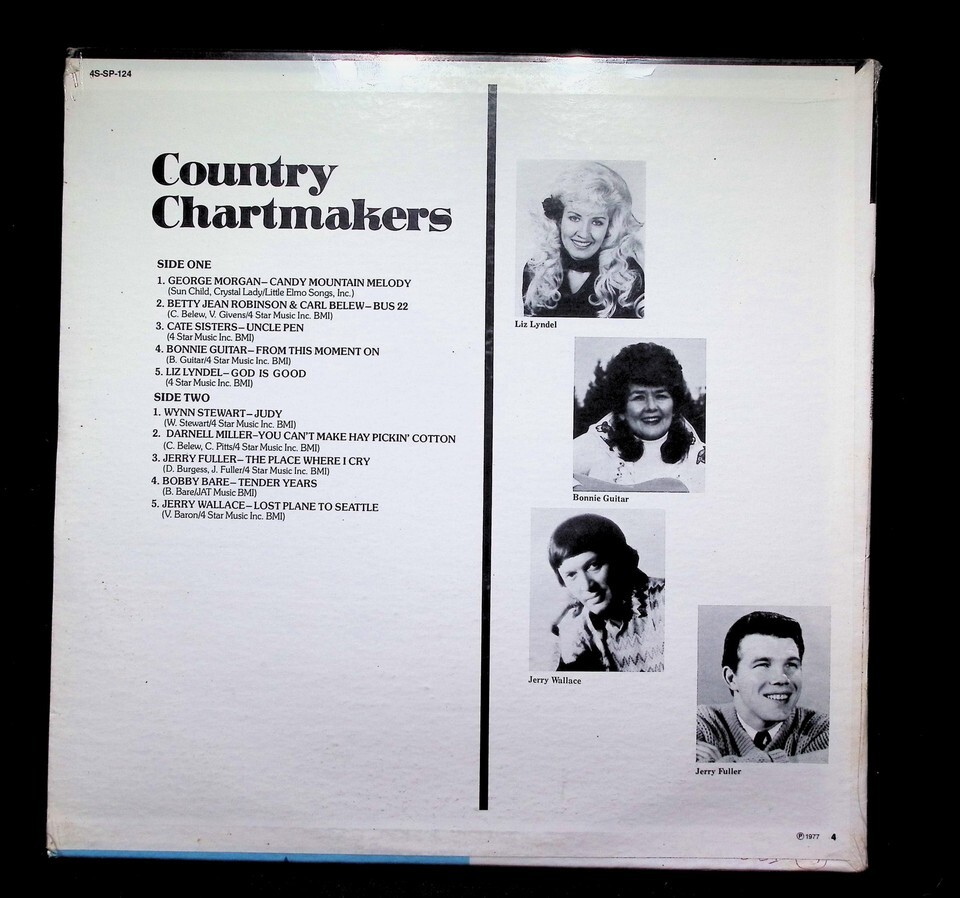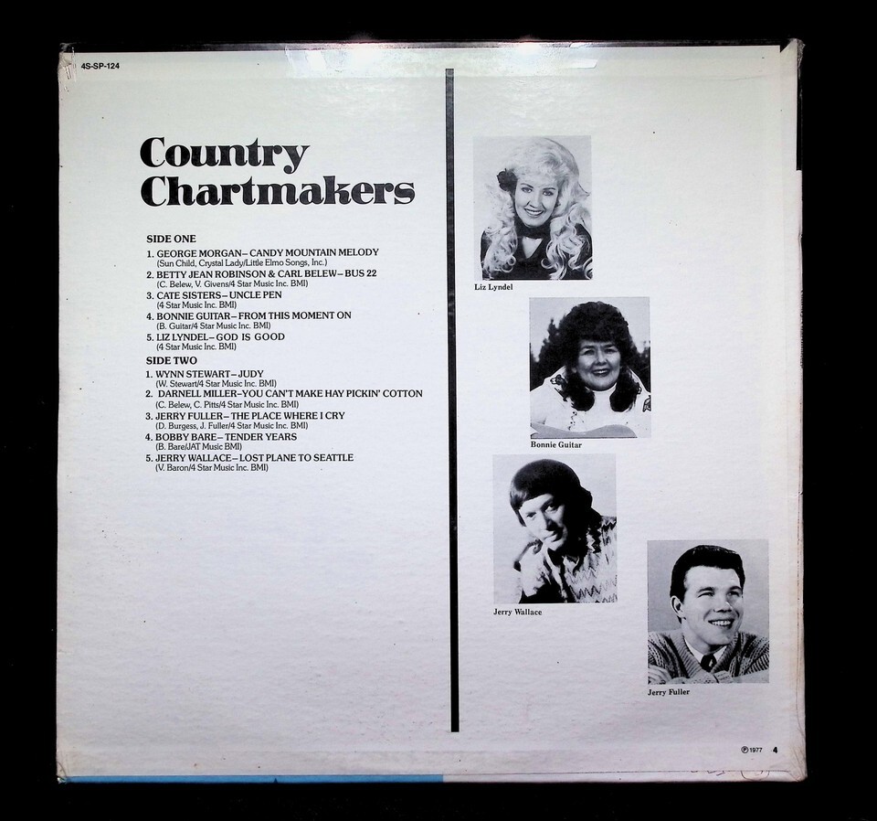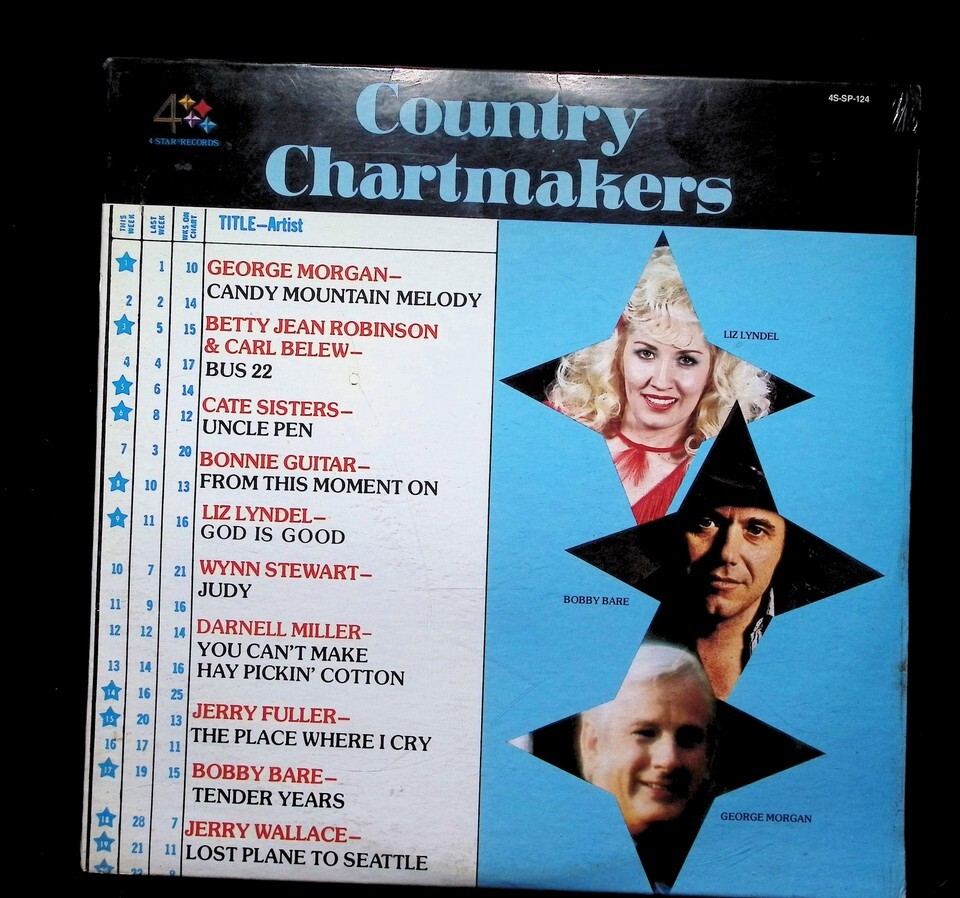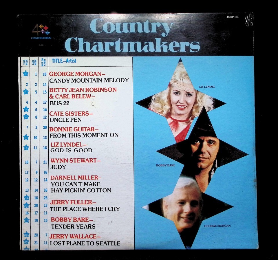 Country Chartmakers is a compilation LP released in the US in 1977 on 4 Star Records (catalog number 4S-SP-124). This stereo LP features a variety of country artists including George Morgan, Betty Jean Robinson, Carl Belew, and Bobby Bare. Tracklist highlights include Candy Mountain Melody, Bus 22, and Tender Years.