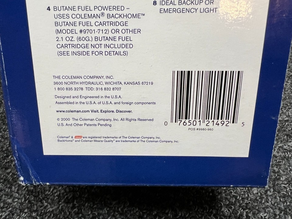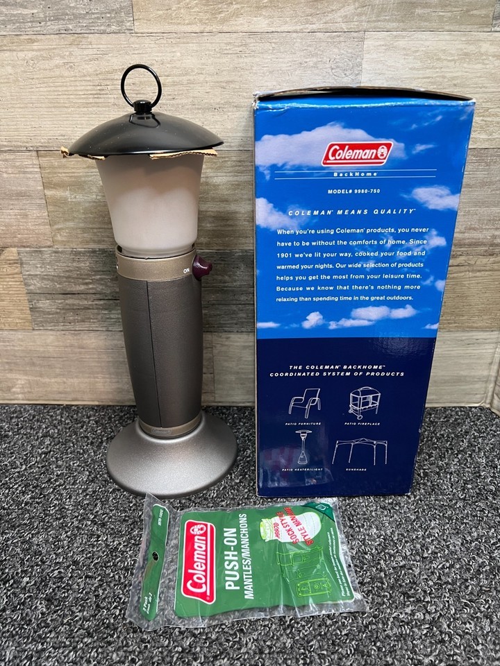 The item for sale is a brand new Coleman Backhome Butane Patio Light Model 9980-750. Unused in original box with mantles.