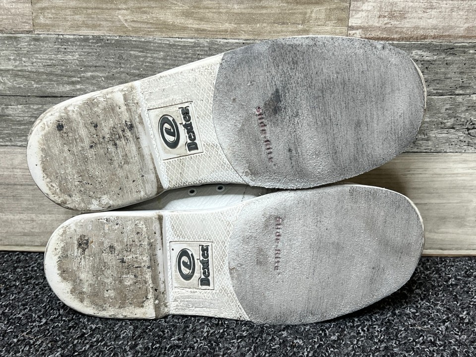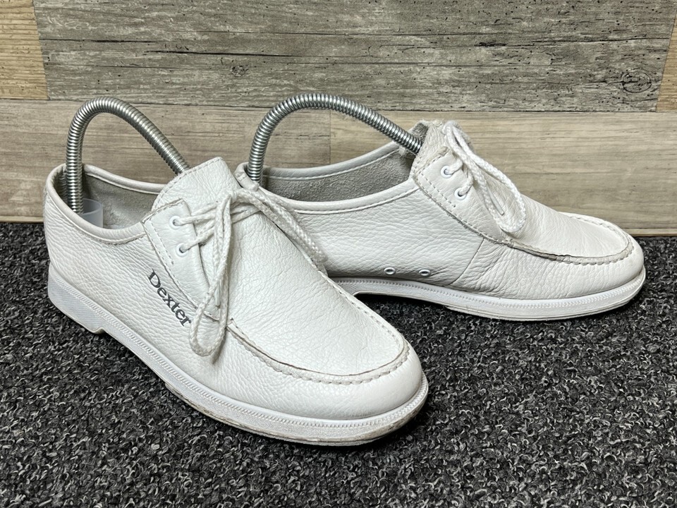 The item for sale is a vintage Vintage Dexter USA Ladies White Leather Bowling Shoes, Women?s Size 7.5 M. In good used condition with minor age-related wear.
