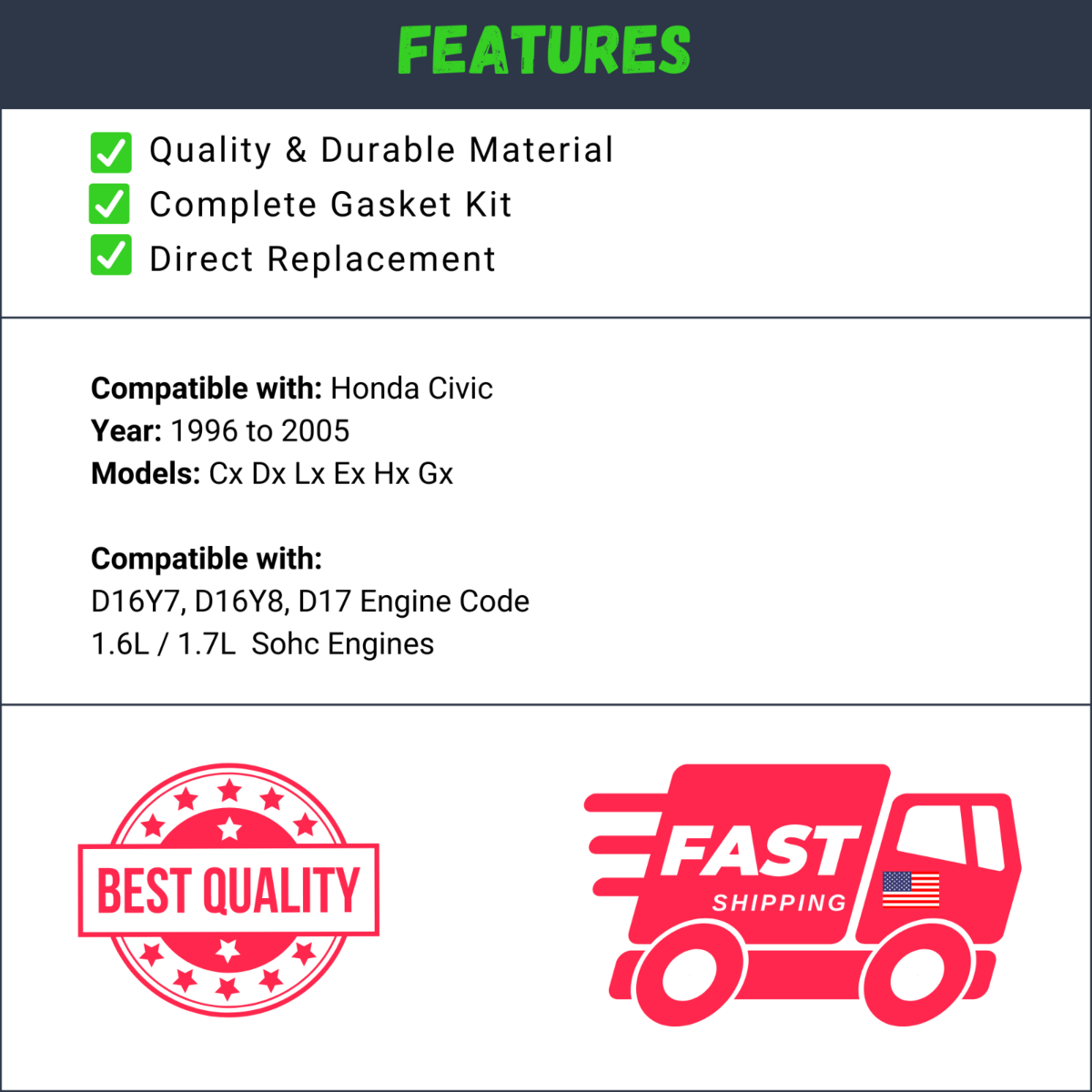 Compatible with D16Y7, D16Y8, D17 Engine Code - 1.6L / 1.7L Engines