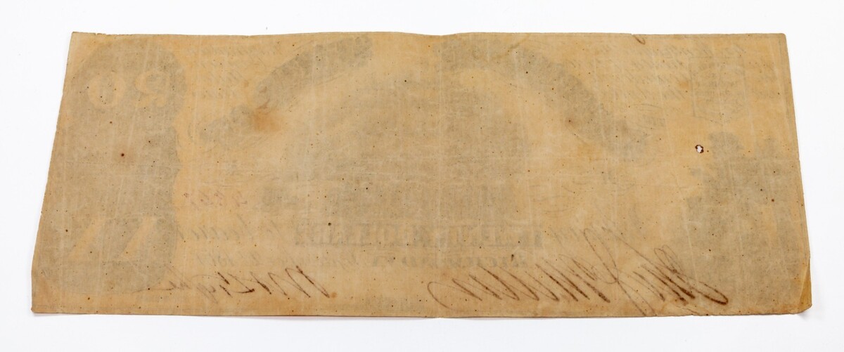 Note is in Fine+ Condition. Margins have some fraying and loss. Corners have folds. Vertical folds and discoloration. A few pinholes. See photos for details.