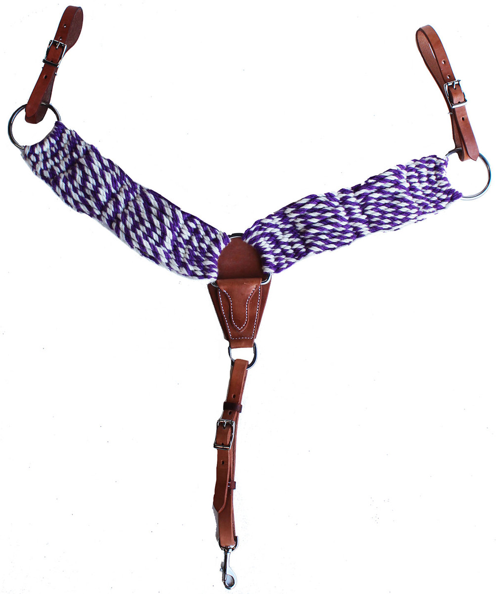 Challenger 100% mohair 25-strand breast collar features premium harness leather up-tugs and a pinch guard center. Rust-free stainless steel hardware. Standard horse size.