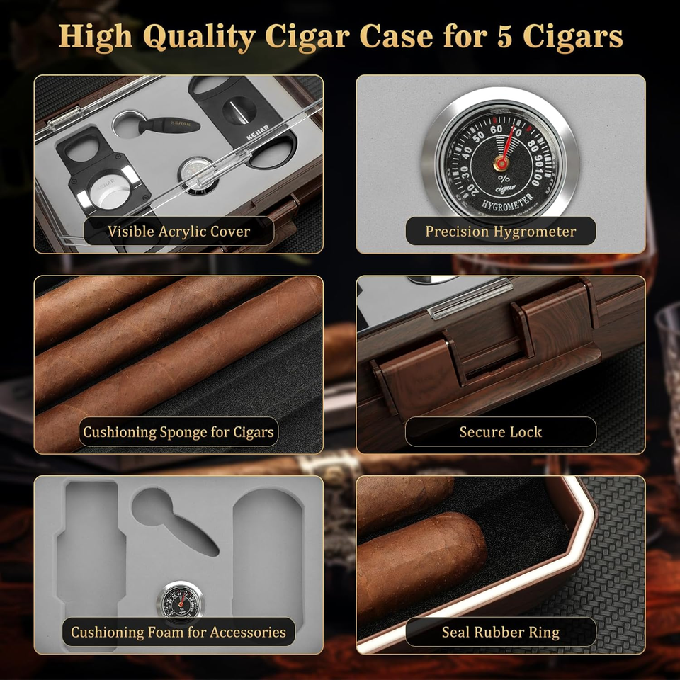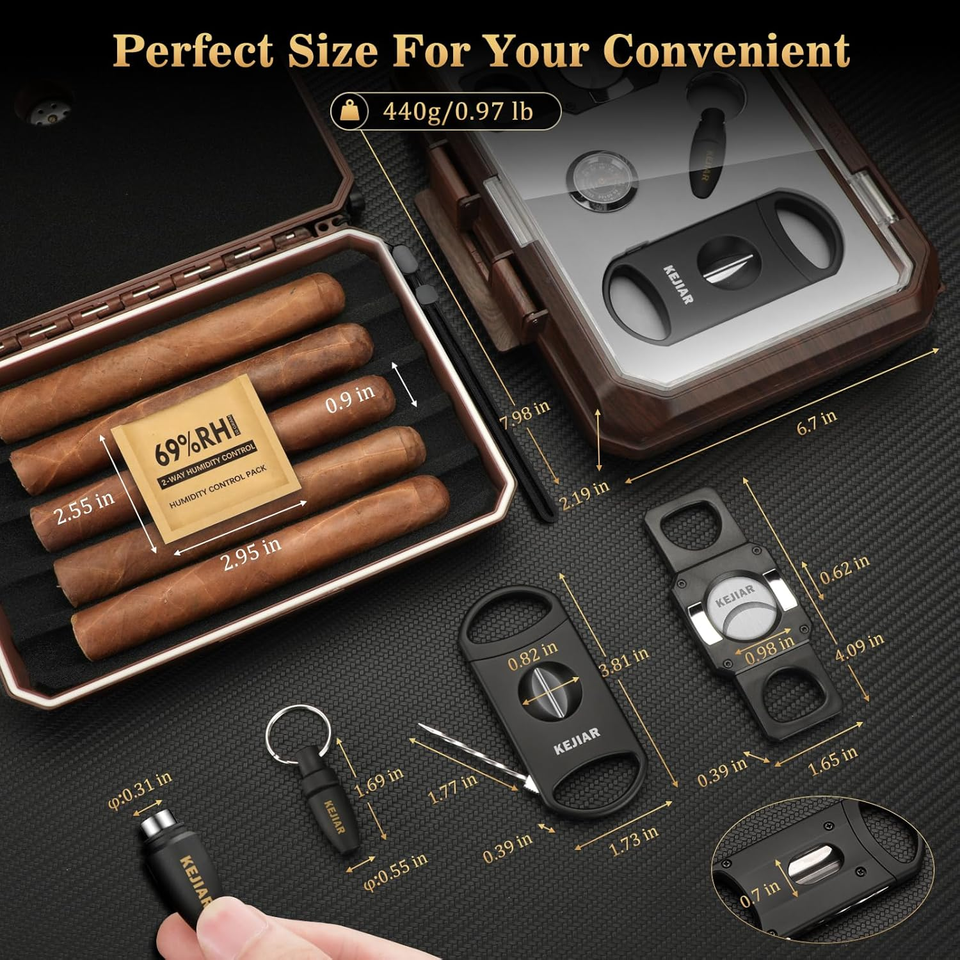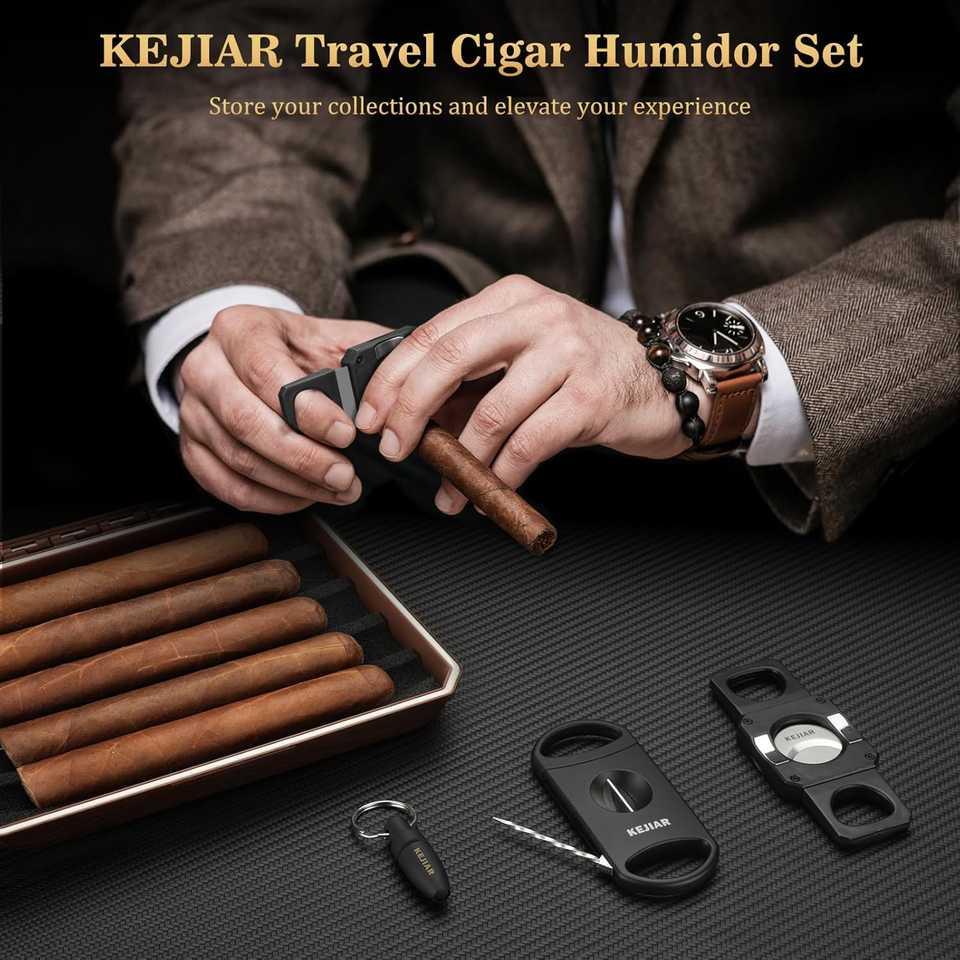 Travel Humidor Set: The KEJIAR Travel Cigar Humidor Set is expertly designed with a double-layer structure, combining essential tools for cigar enthusiasts. Included in the set are a sharp V-cutter with a cigar holder and draw enhancer, a smooth straight cutter with a cigar stand, and a compact cigar punch. The top layer conveniently stores all accessories, while the bottom layer accommodates up to five cigars. Measuring 8*2.16*2.48 inches and weighing just 440g, this lightweight humidor is easily portable, making it ideal for travel in suitcases or backpacks.