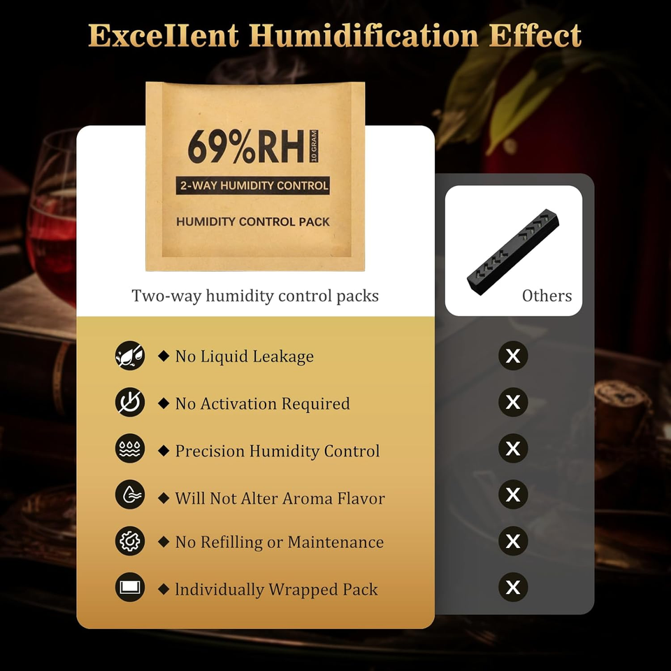 Ideal Humidity System: The built-in hygrometer allows you to monitor humidity levels effortlessly, preventing your cigars from drying out or becoming overly moist. Accompanied by a 69% two-way humidity control pack, it maintains the optimal humidity range for your cigars. This pack requires no activation and eliminates concerns about liquid leakage, ensuring that your cigars remain fresh and flavorful throughout your journey. Enjoy peace of mind knowing your cigars are stored in top condition, no matter where you are.