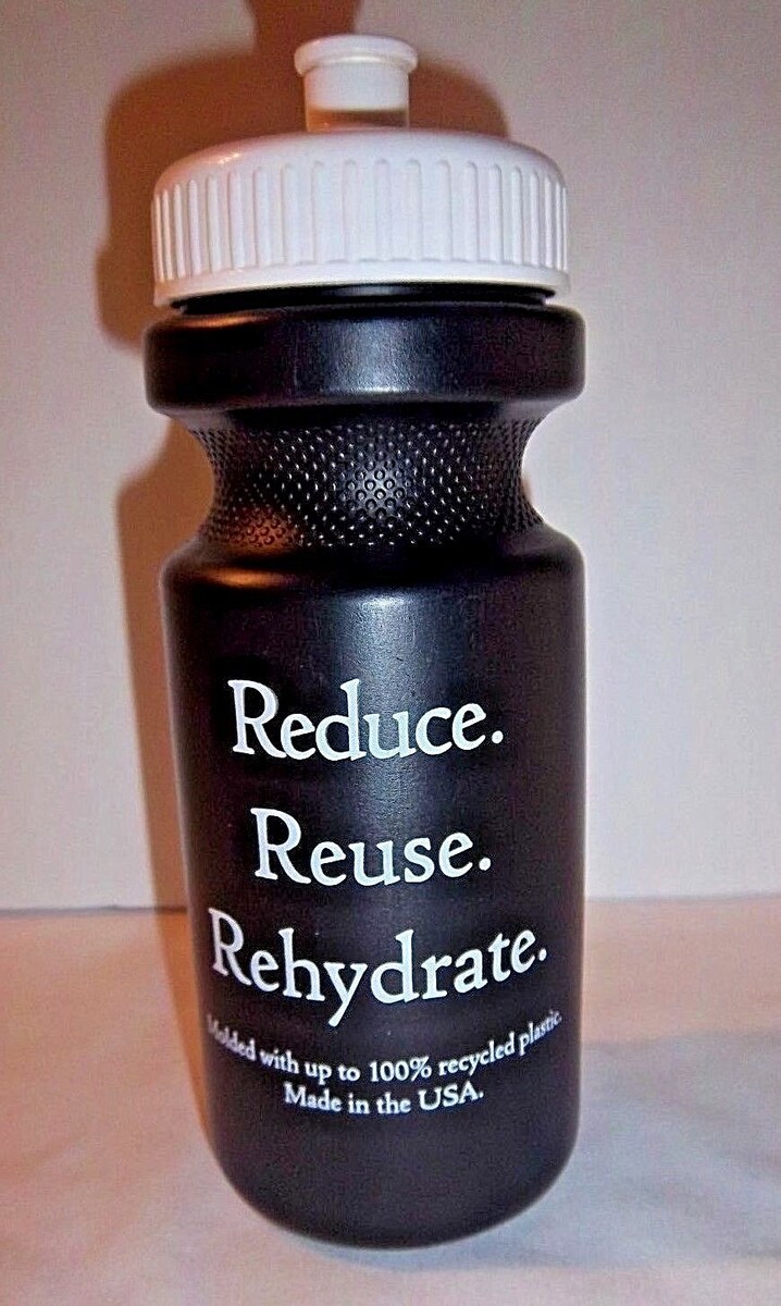 Bottle is molded with up to 100% recycled plastic 'Reduce. Reuse. Rehydrate.'