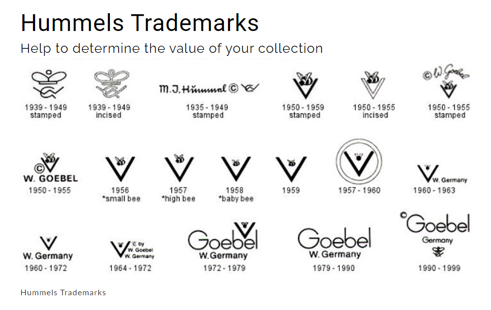 The 1950s were characterized by Hummel's launch of their bee design marks. These stamps depict various differently styled bees sitting inside a V. The company actually changed the bee's shape and size every year from 1956-1959.