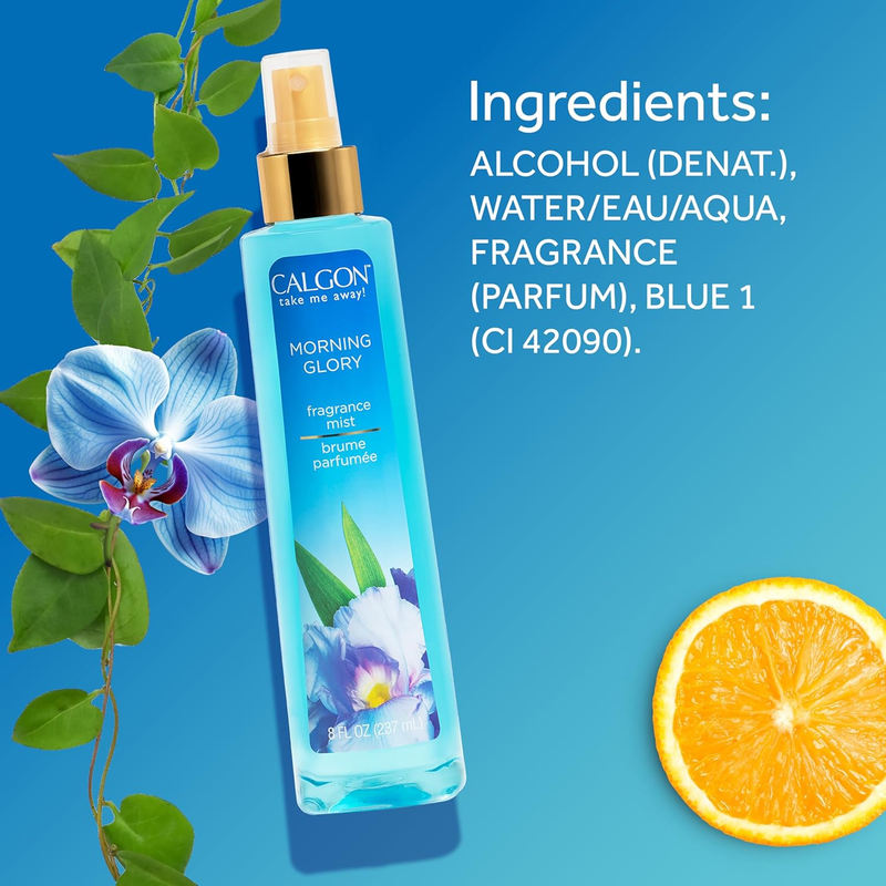 Escape the hustle and bustle of the daily grind with a spritz of Calgon Morning Glory Body Fragrance Mist. This product delivers a fresh, floral, and fruity burst combining the sweetness of violet and apple with the zestiness of orange. A luxurious middle layer of orchid, jasmine, geranium, and rose follows, leading to a calming base of musk, oak moss, sandalwood, and amber.