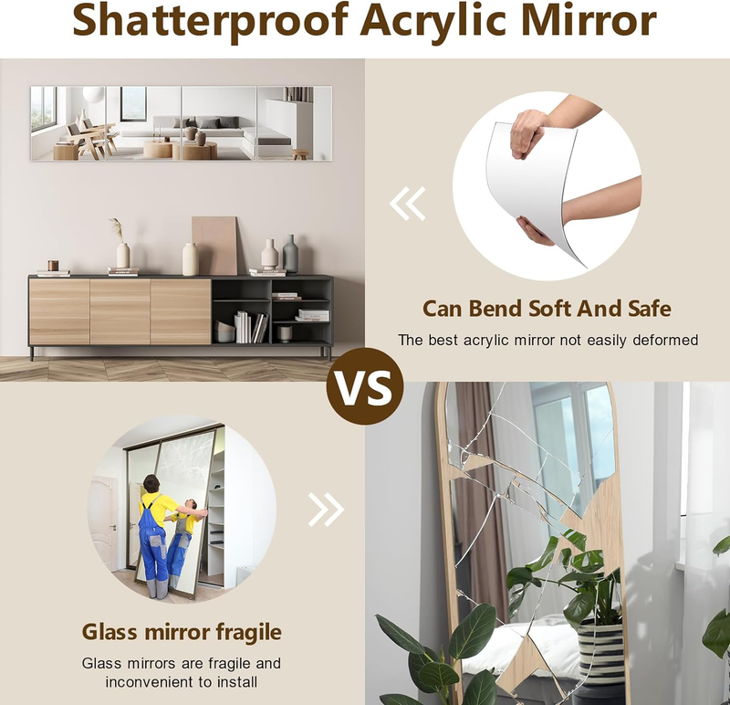 (Acrylic Material) : The mirror is made of acrylic material;Eco-friendly plexiglass mirror. shatterproof, it is a great alternative to a real mirror tiles that can break . even if it falls on the ground, it can be used safely, kids and toddler can touch it at close range.