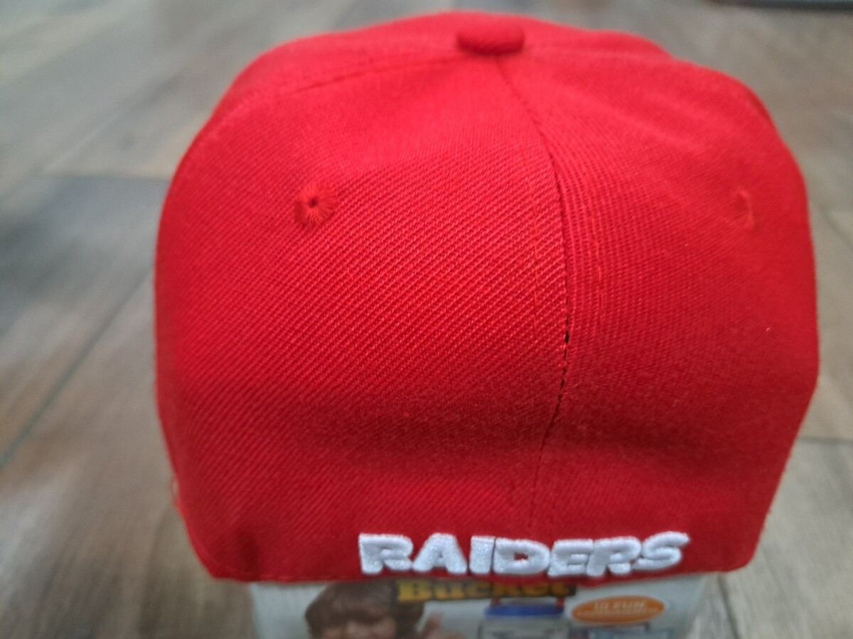 Color: Red hat with a black and white 60th-anniversary side patch featuring a bomb graphic and the Raiders shield logo