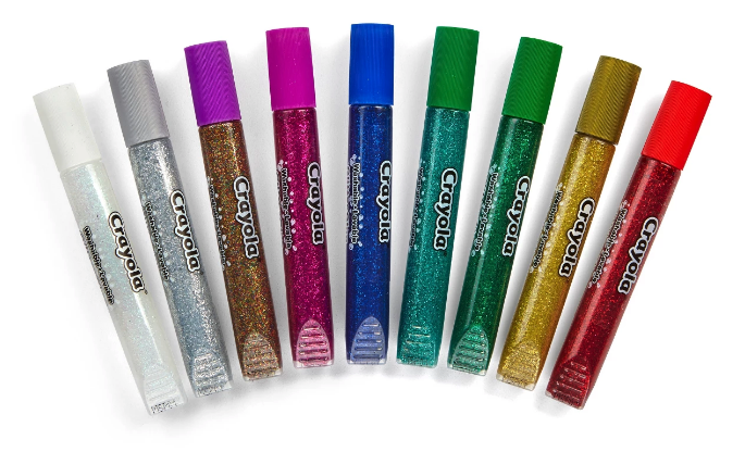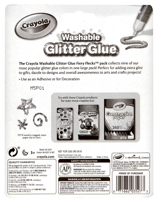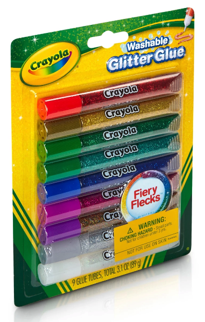 This is for a brand new pack of Crayola Washable Glitter Glue, Assorted Colors Fiery Flecks 9 Tubes 3.1 oz