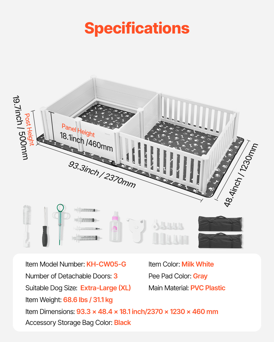 Two-Room Whelping Box for Extra-Large Dogs: Sized at 93.3x48.4x18.1 inch / 2370x1230x460 mm, this whelping box is built for extra-large dogs, offering a spacious and comfortable area for puppy growth. Please CONFIRM your dog’s weight, height, and length before purchase