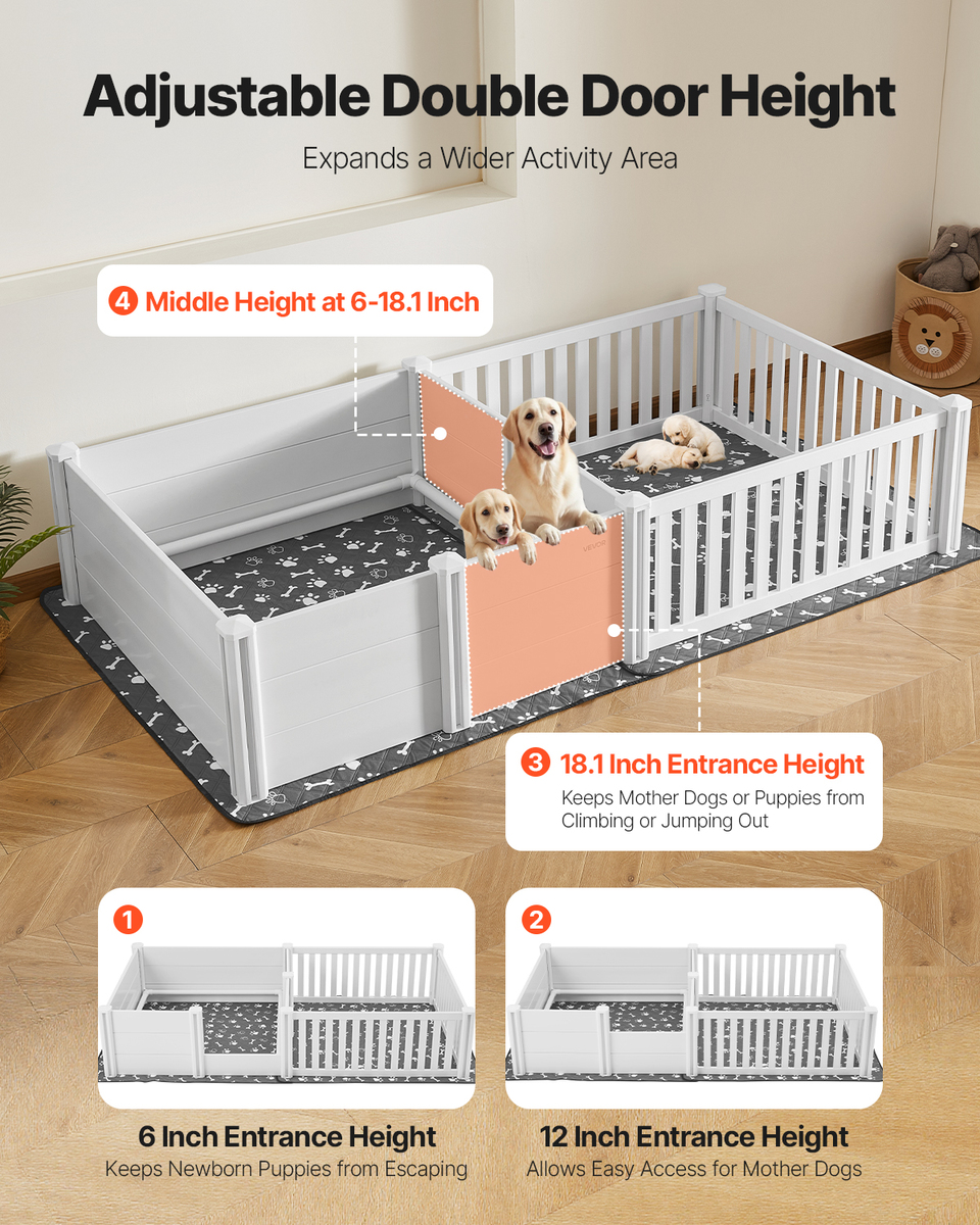 Adjustable Double Door Panels: The entrance of this indoor dog enclosure adjusts to three heights. 8 inch to block newborns, 16 inch for mother dog access, and 24 inch to avoid jumping or climbing. The center divider can also be adjusted to two heights. 6 inch to 12 inch for easy mom access, and 18.1 inch for separate spaces as puppies grow. Designed to support every growth stage