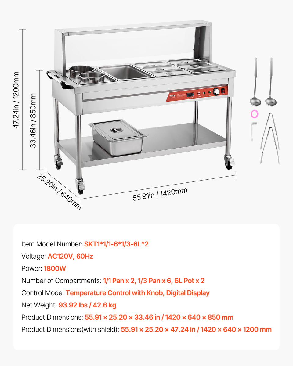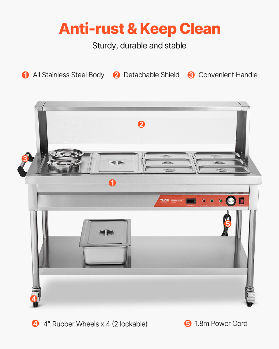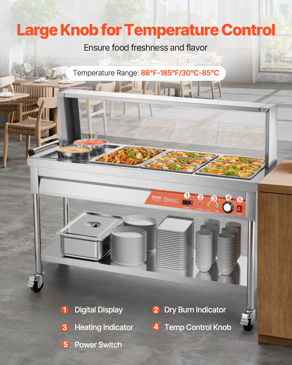 Thoughtful Details: The removable sneeze guard allows customers to select food with security and reliability. The large undershelf is perfect for storing extra tableware and utensils. With a 1.8m power cord and main power switch design, it eliminates distance limitations to outlets. Widely used in cafeterias, hotels, fast food restaurants, supermarkets, and more