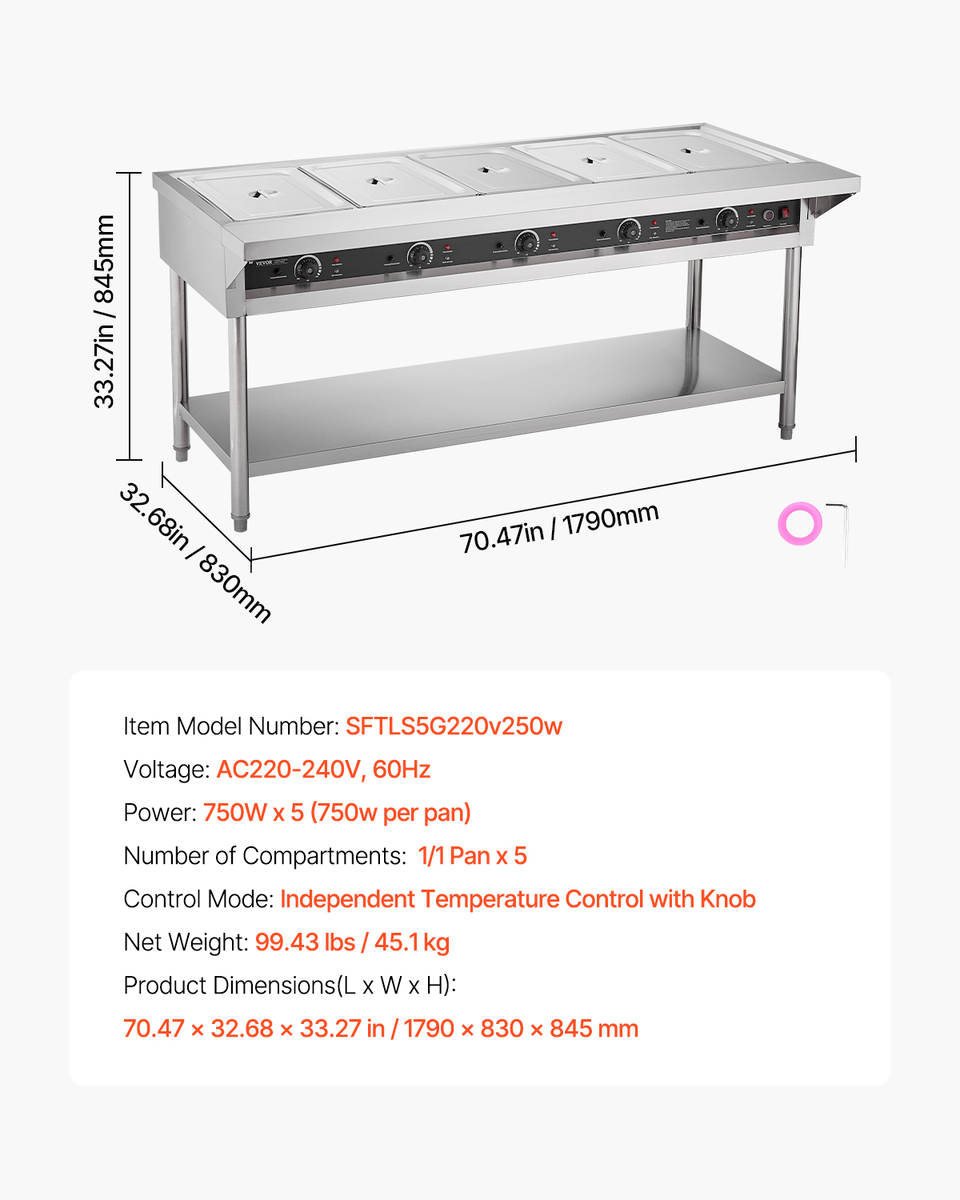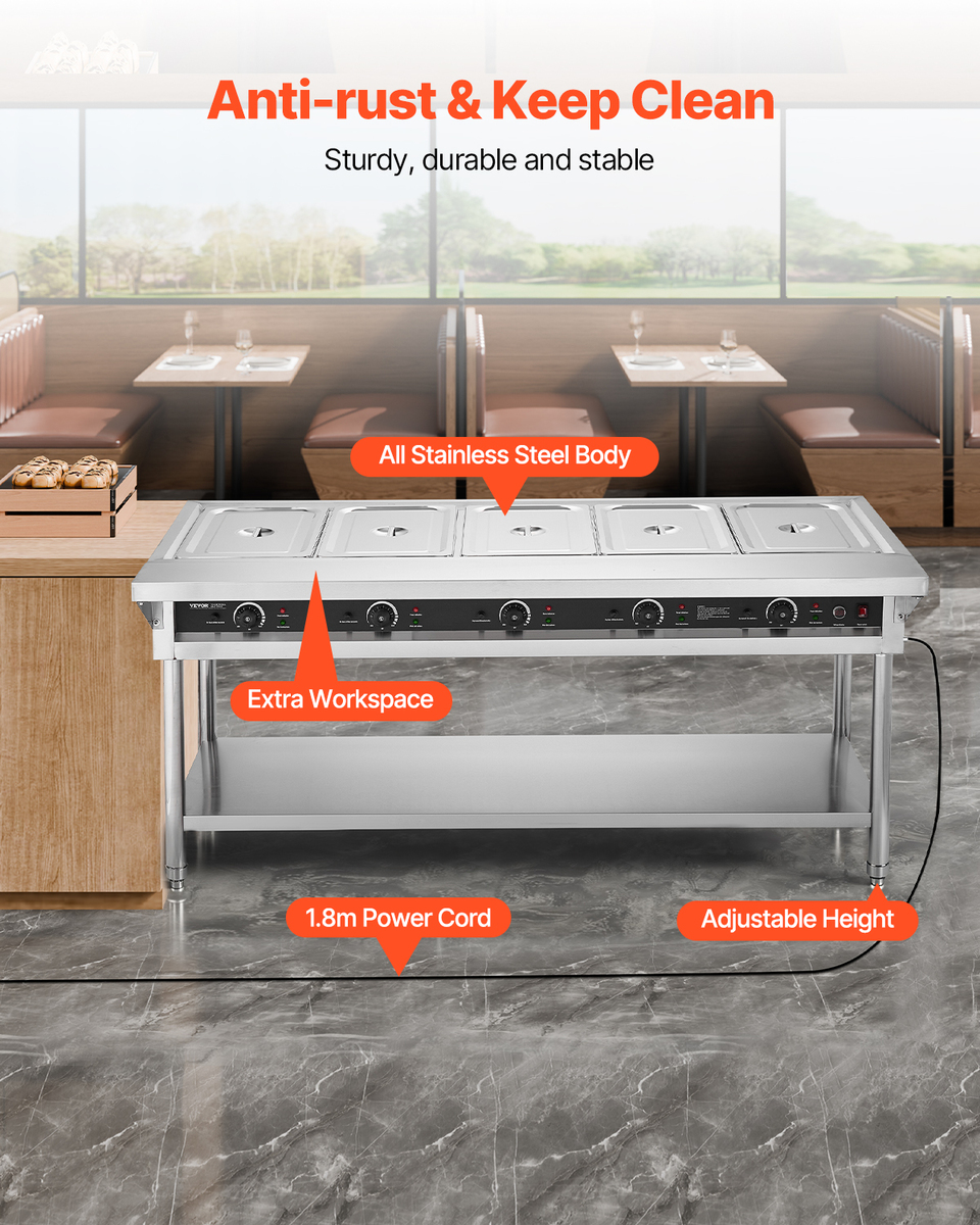 Premium Materials: The electric steam table is fully made of stainless steel, offering corrosion resistance, durability, and easy cleaning. High-quality, thick, anti-cut pans can be directly washed in water. Adjustable height table legs ensure the table remains level in different scenarios. The bottom drain valve makes it easy to remove any remaining water from the machine
