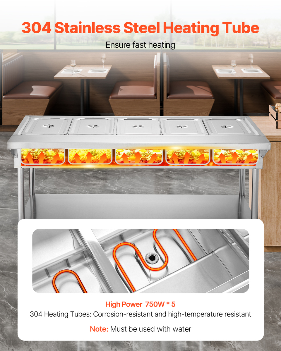 Efficient Heating: The premium 304 stainless steel heating tube provides fast and even heating, corrosion-resistant and high-temperature resistant, offering better circulation. The commercial electric food warmer is ideal for warming stews, pasta, congee, soup, and more at the perfect temperature