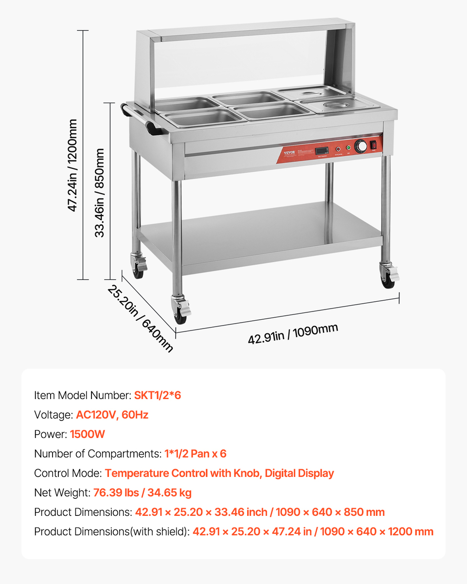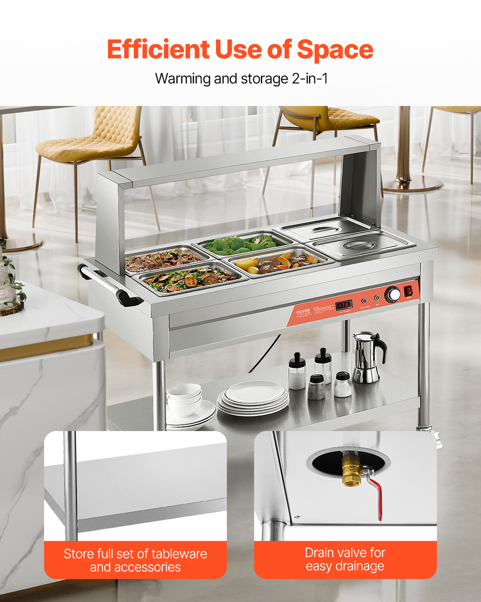 Thoughtful Details: The removable sneeze guard allows customers to select food with security and reliability. The large undershelf is perfect for storing extra tableware and utensils. With a 1.8m power cord and main power switch design, it eliminates distance limitations to outlets. Widely used in cafeterias, hotels, fast food restaurants, supermarkets, and more