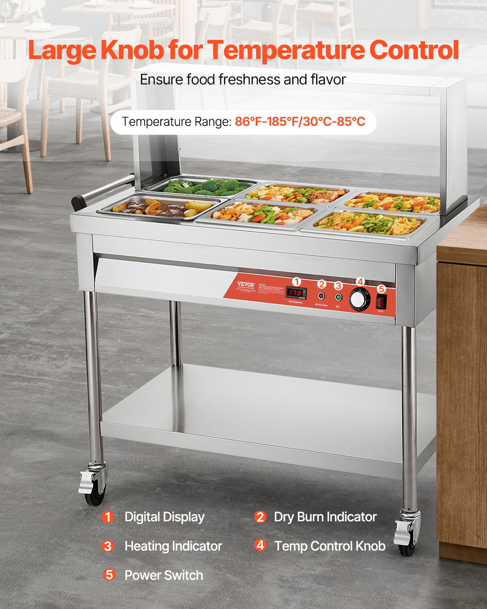 Commercial-Grade Large Capacity: With six 1/2-size pans, our steam table is designed for a variety of dining needs. Our standardized machine dimensions are compatible with all pans up to 5.9 inch in depth