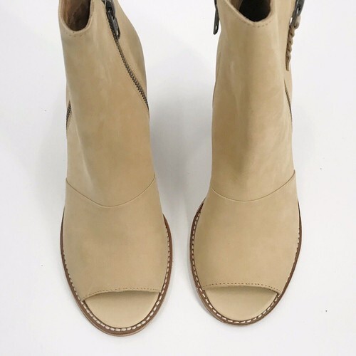 Open toe, leather, side zips, tan color |