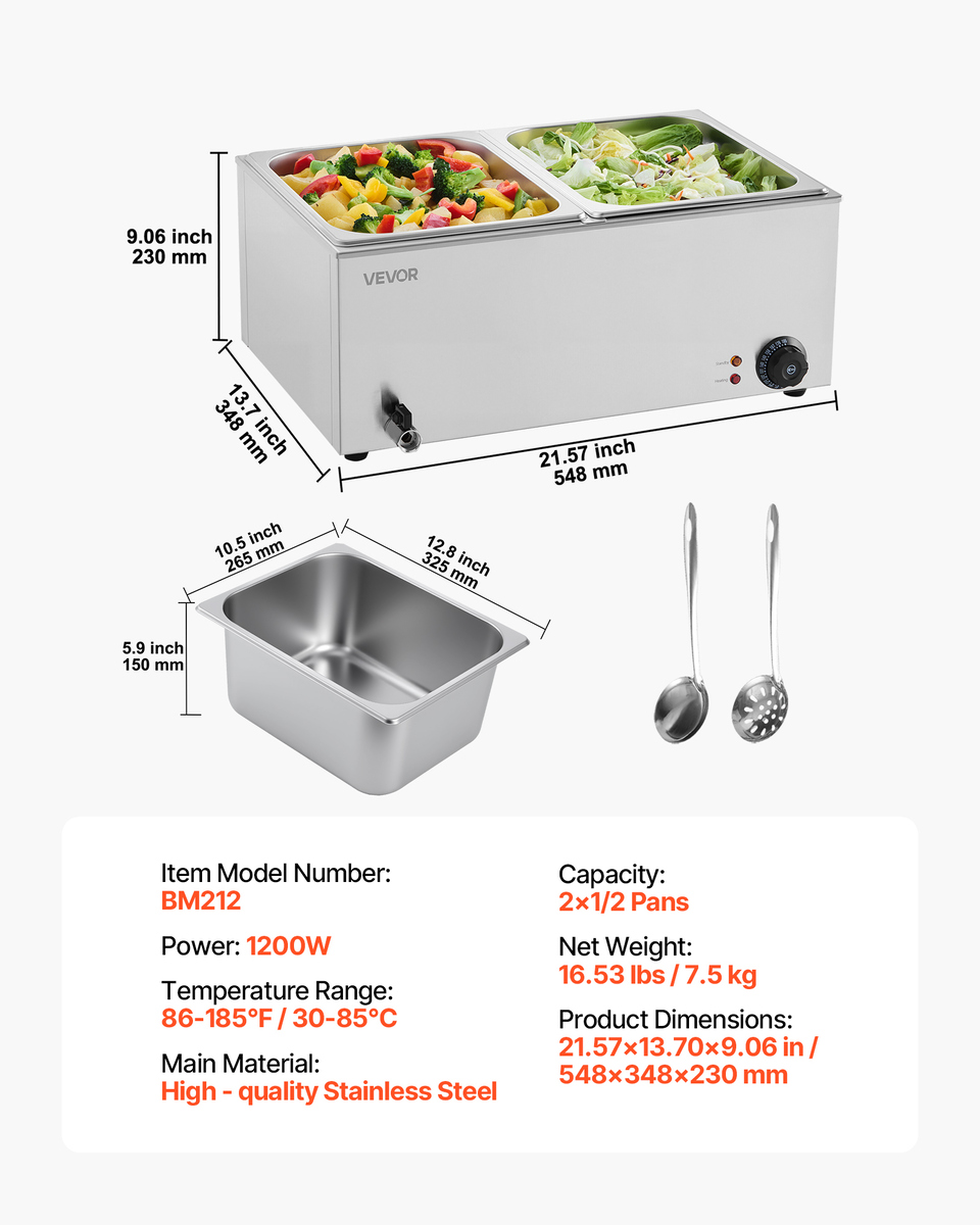 Includes 2 Pans: Our commercial food warmer comes with 18qt / 17L food pans (2*1/2) accompanied by their respective lids, allowing you to serve different dishes simultaneously. Feel free to change up your menu from soups and sauces to stew, or even nacho cheese and chocolate.