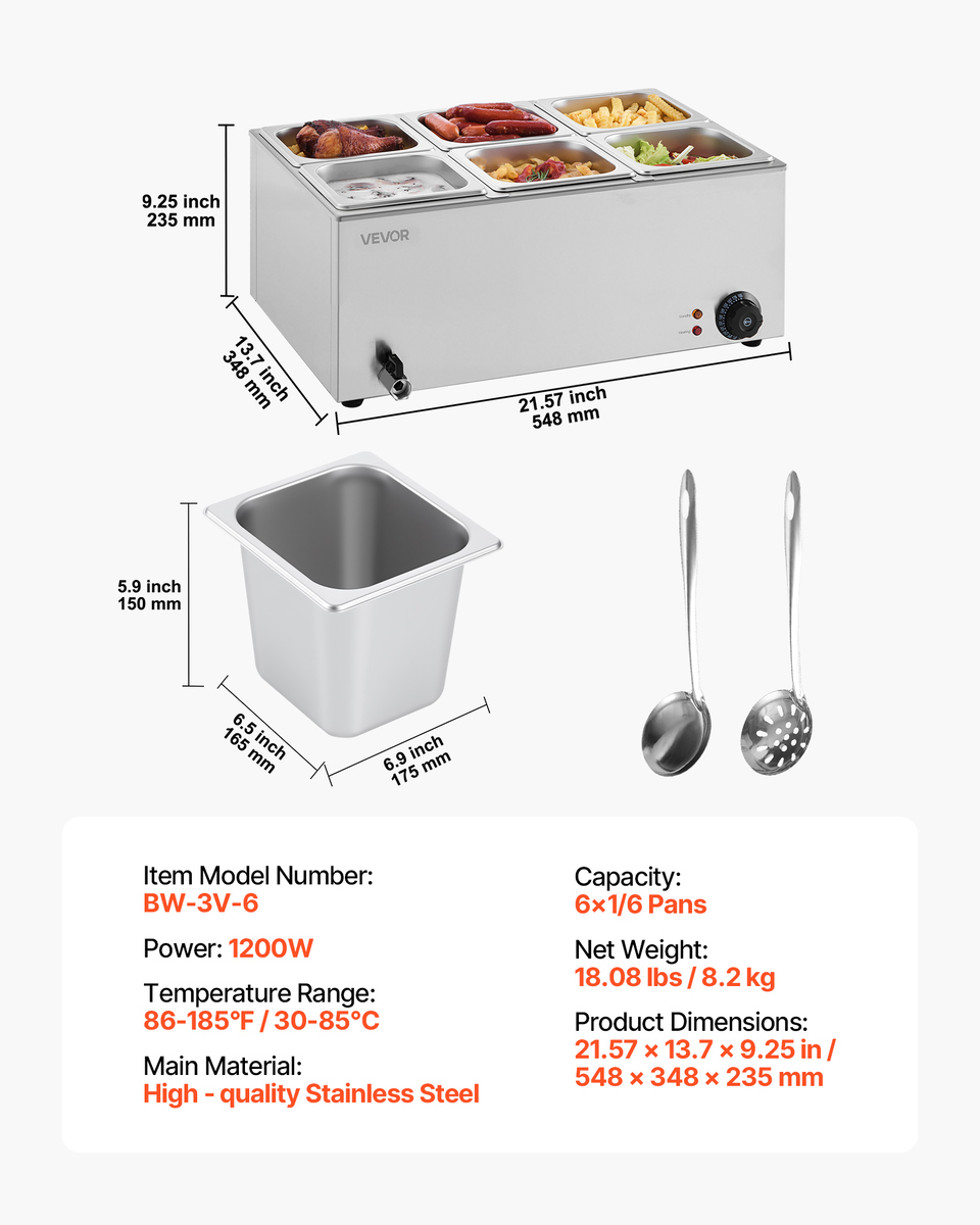Includes 6 Pans: Our commercial food warmer comes with 14.3qt / 13.5L food pans (6*1/6) accompanied by their respective lids, allowing you to serve different dishes simultaneously. Feel free to change up your menu from soups and sauces to stew, or even nacho cheese and chocolate.