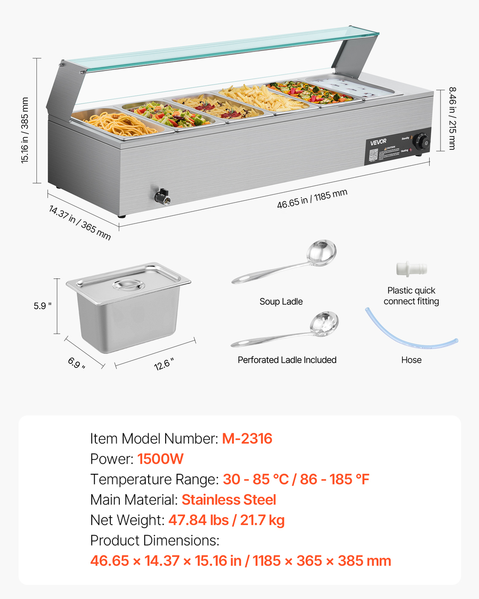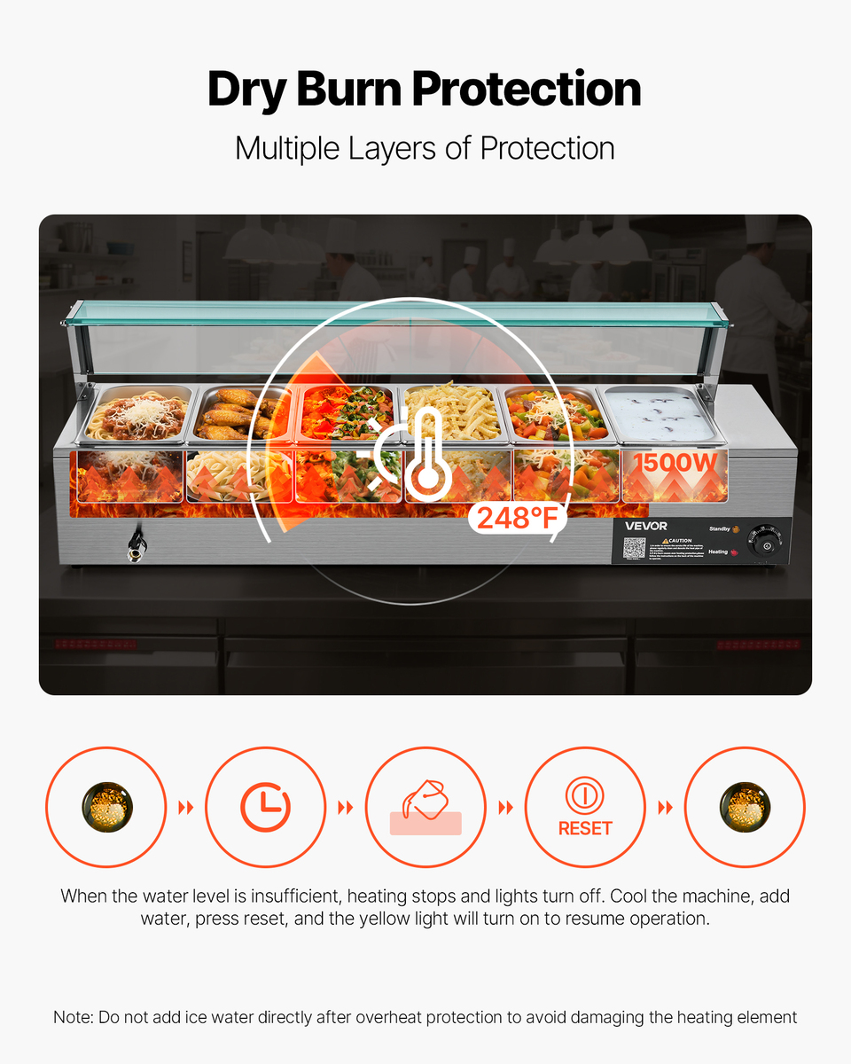 Fast Even Heating: Equipped with a strong 1500W stainless steel heating tube, this commercial food warmer heats food quickly to keep flavors fresh. You can set the temperature from 86–185F (30-85C), adjusting to suit various dishes and serving needs